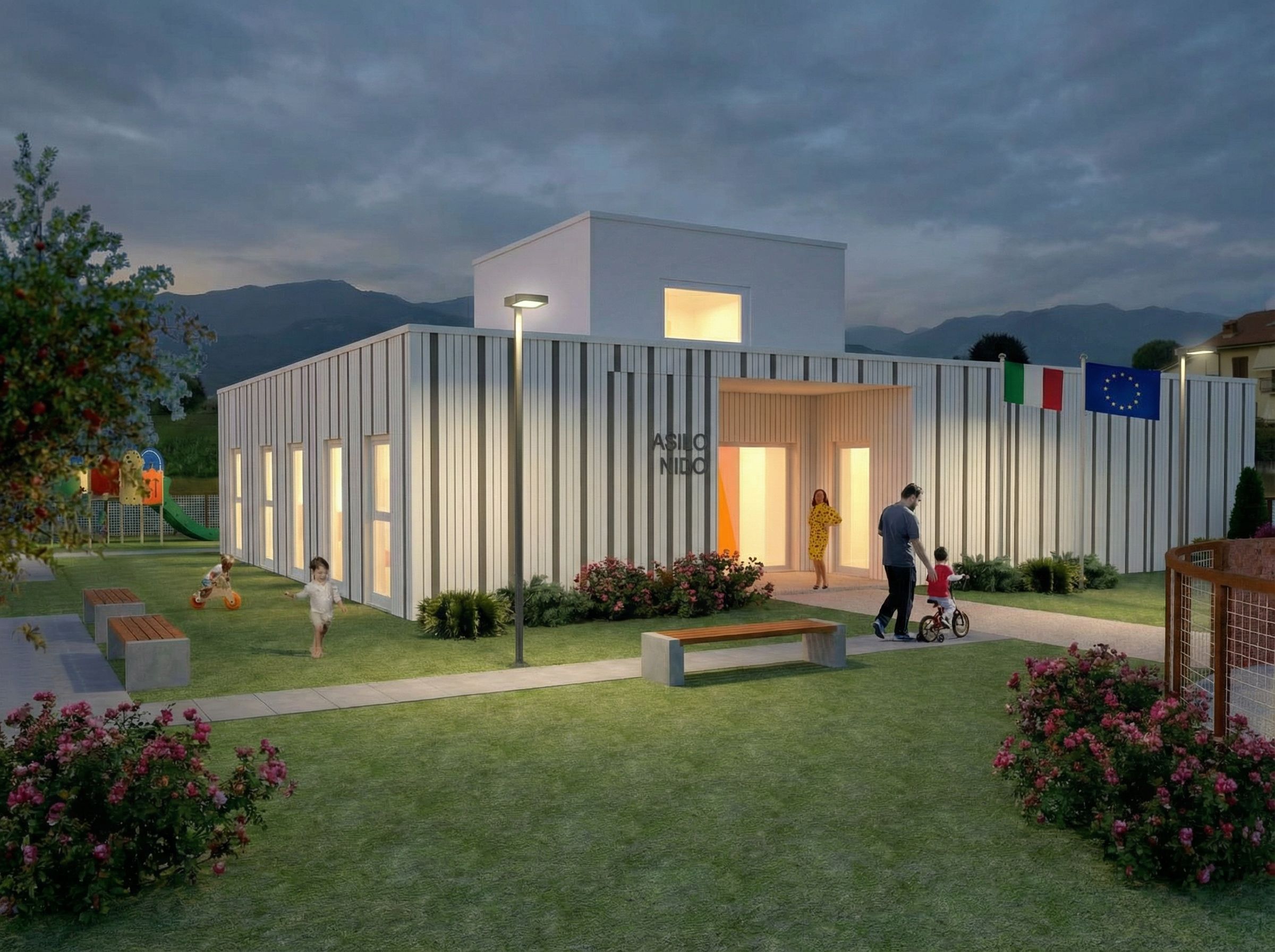 architectural exterior rendering, render this 3D mass into photorealistic rendering, realizzazione di variante render fotorealistico con facciata tutta bianca compreso ingresso ,righe verticali larghezza 5 cm a distanza irregolare colore canna di fucile anche in corrispondenza delle finestre sul lato corto , eye level view, dusk atmosphere with soft lighting, including people, greenery and vegetation, trees, street furniture, high quality, professional, detailed scene