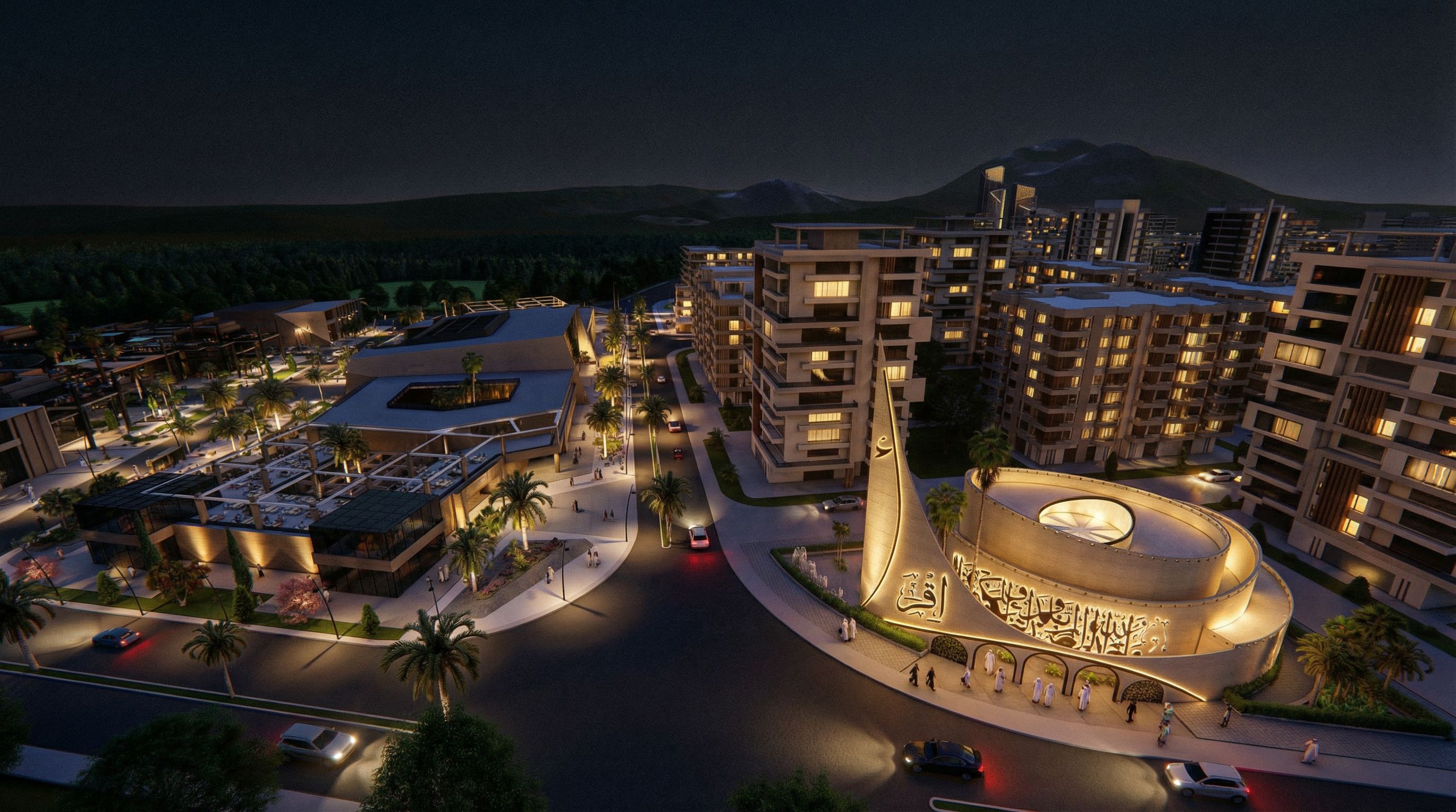 PromptPhoto of a contemporary MOSQUE ON THE RIGHT, highlighted by smooth concrete surfaces and intricate calligraphy detailing on its façade. Surrounding, modern residential structures feature varying textures and materials, creating a rich urban landscape. Palm trees line the street, enhancing the OASIS feel. The scene is bathed in warm golden hour light, casting soft shadows and illuminating the building's architectural features. Captured from an aerial perspective with a wide-angle lens to encompass the harmonious integration of structure and environment, emphasizing depth and spatial relationships.