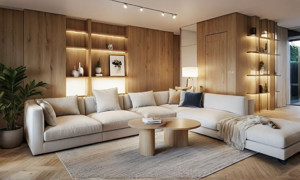 Promptcosy light living room with white coffee tables, with light oak wooden walls
