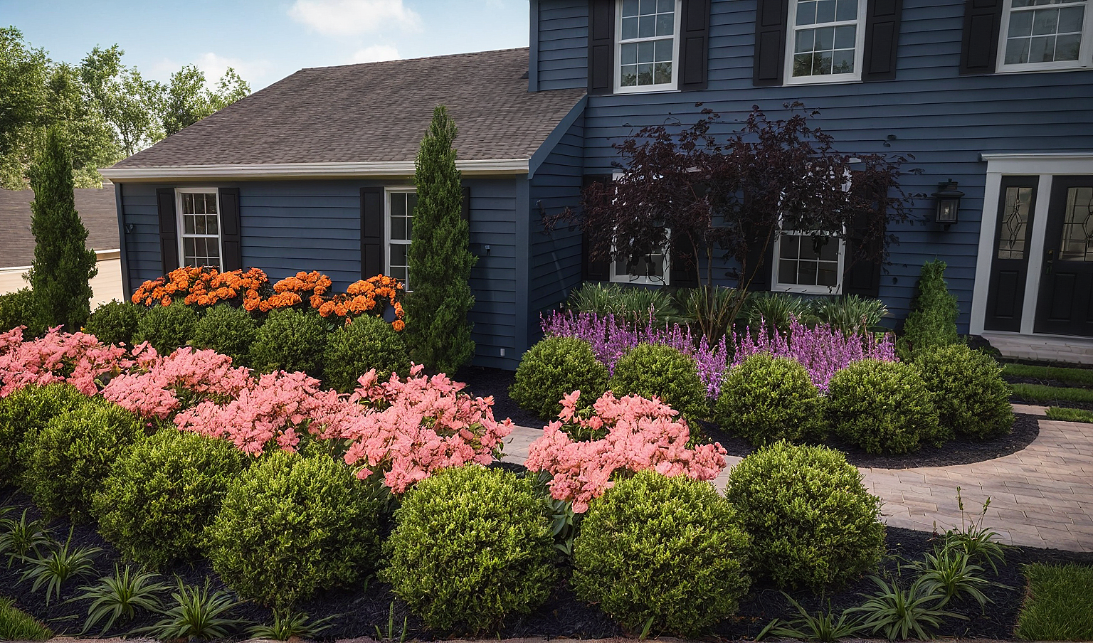 PromptNavy house, paver walkway, boxwoods, black shutters, pink salvia plants, brown mulch, lawn, orange roses, lilyturf