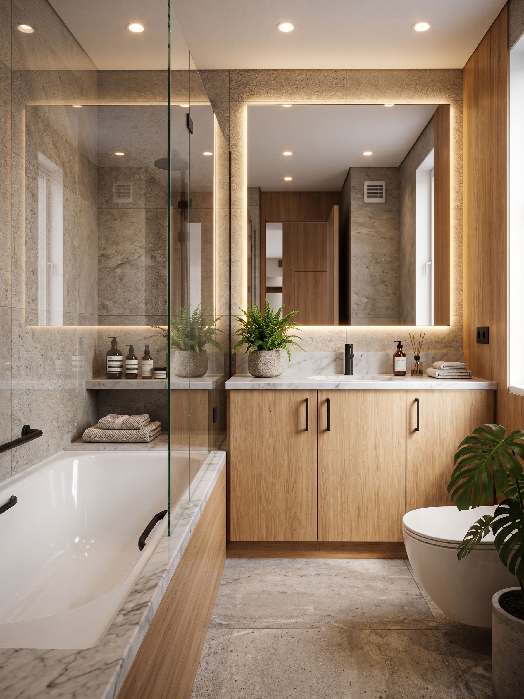 PromptDecorar casa de banho conforme referência. Luzes acesas, keep exact camera angle