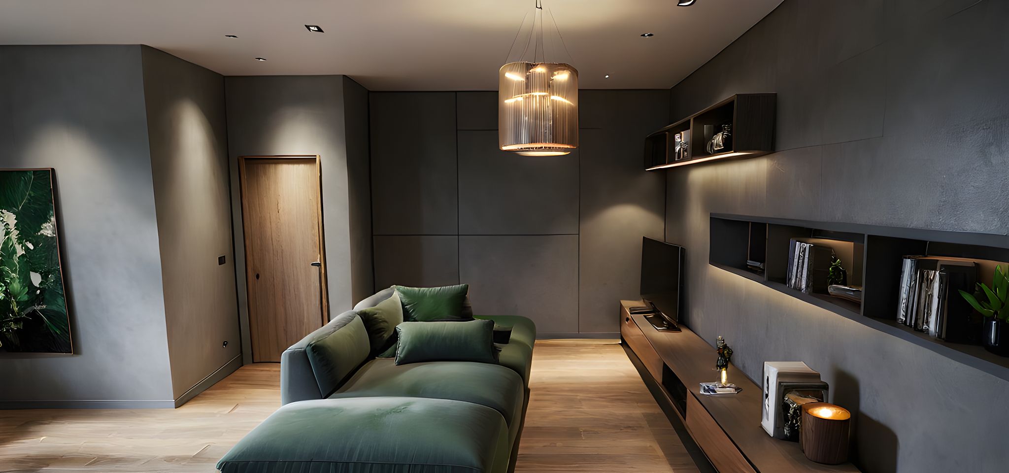 Photo of a modern living room showcasing minimalistic design elements with a sleek grey sofa and a clean wooden media unit. The interior features smooth textures on walls and polished wood flooring, highlighted by a large window that brings in natural light and frames green foliage outside. Soft shadows play across the room, enhanced by a warm pendant light. The camera angle captures the room from above, focusing on the arrangement of furniture and decor, using a wide-angle lens to emphasize spaciousness and create a welcoming atmosphere.