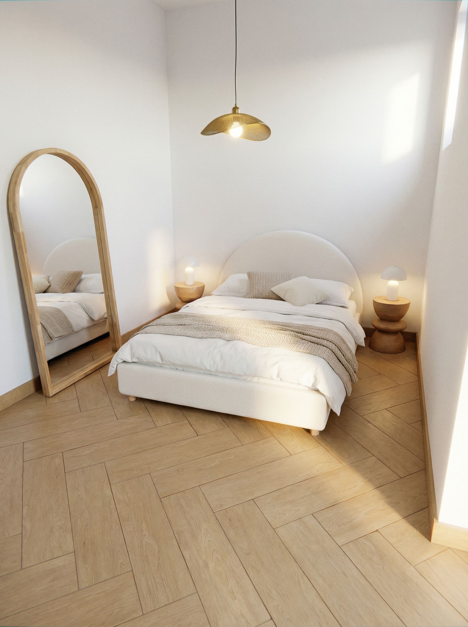 Promptretirar candeeiros suspensos e colocar quarto conforme referência . Cama com costas na parede frontal. Colcar um candeeiro suspenso no centro do quarto conforme referência. Luzes acesas , keep exact camera angle