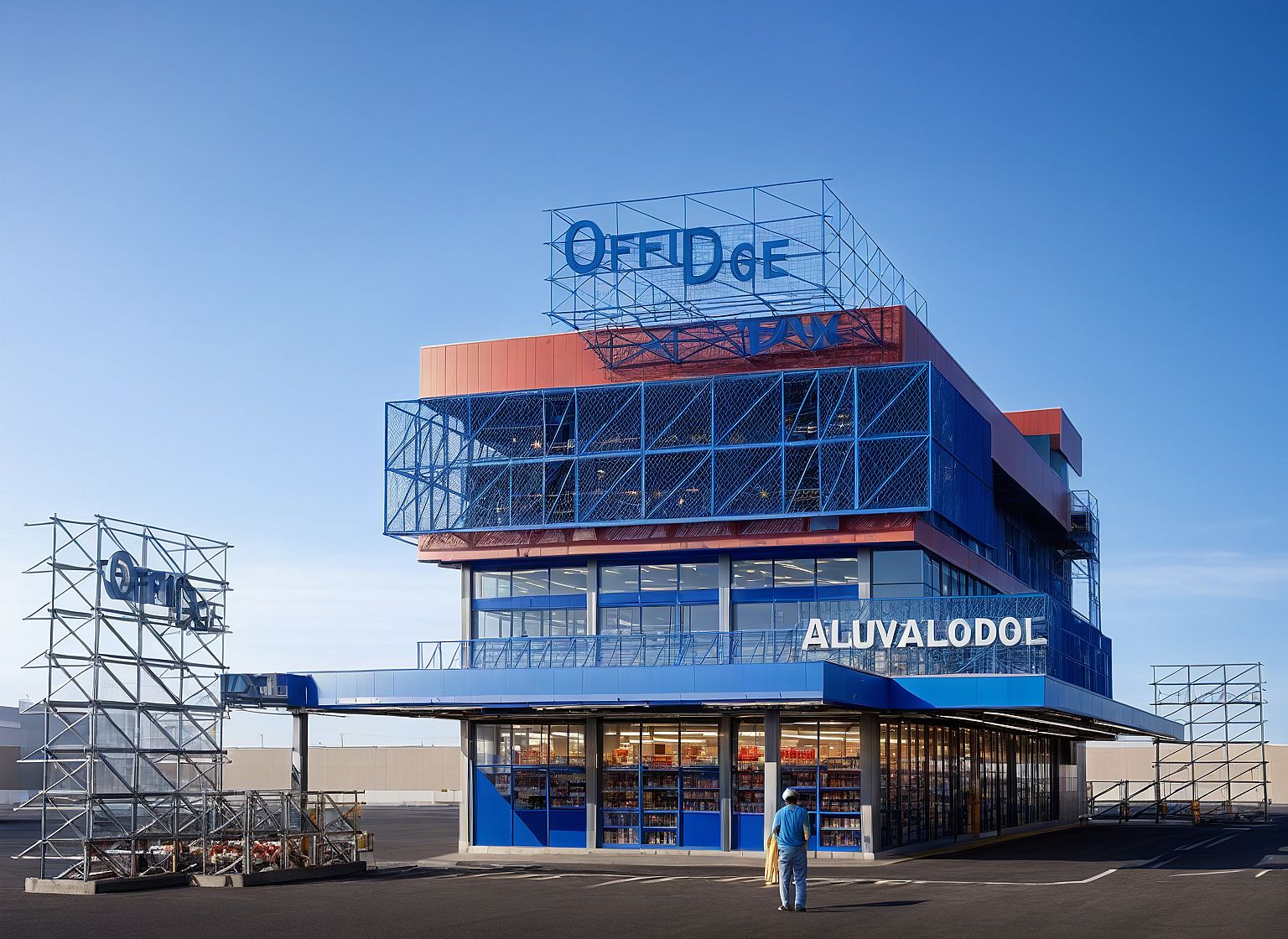 Promptthe blue color in the front is a steel wire mesh blue in color and lower ground its a supermarket with warm color interior . Live color is matt finich paint and frame in the top is scaffolding and signage is with neon lights