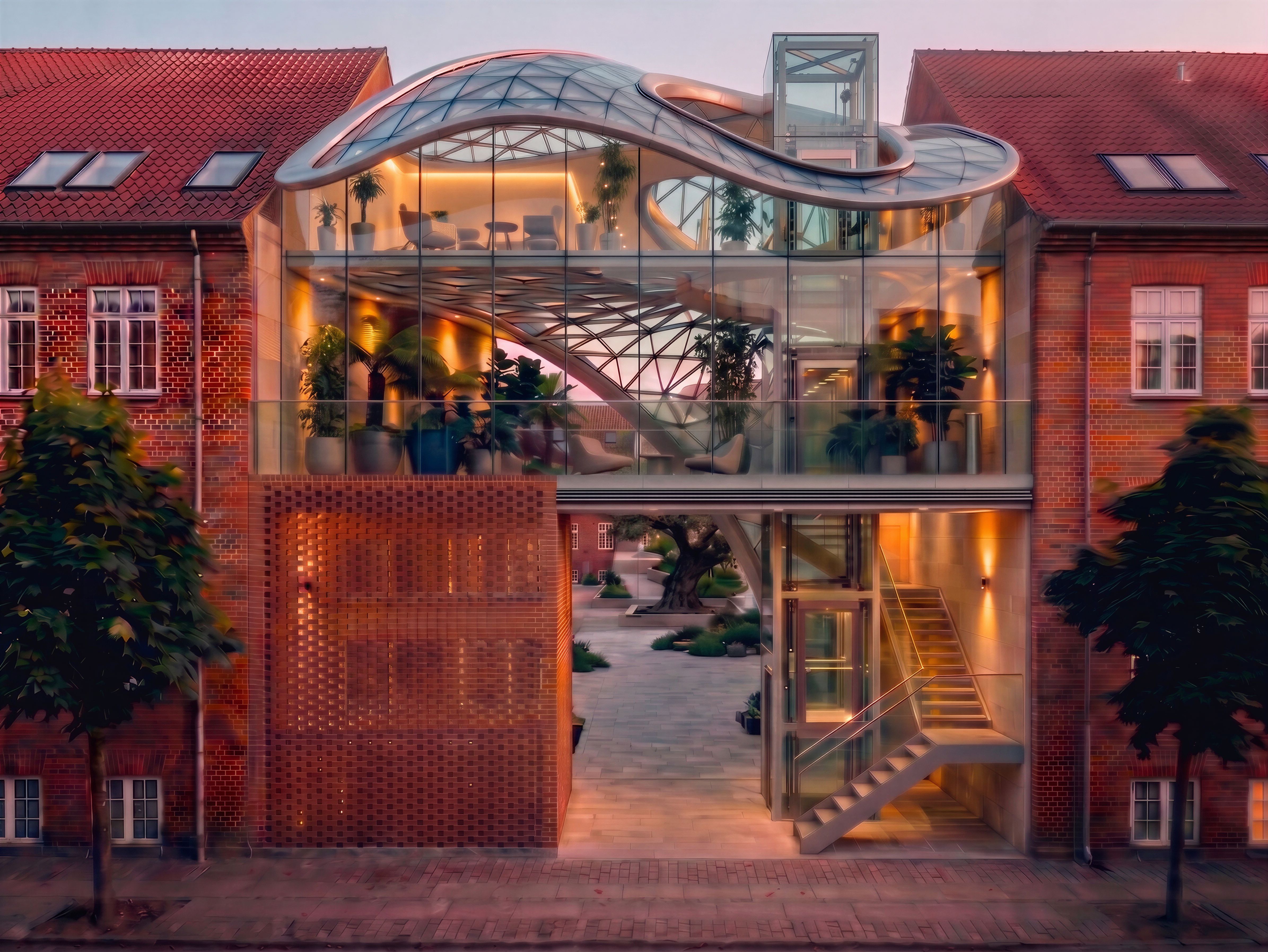 PromptEdit this image. Raise only the top of the ergonomic roof of the top-floor volume 2 meters above the ridge of the red brick roof so that the volume is taller underneath. The curved roof must be 2 meters higher than the roof., keep exact camera angle