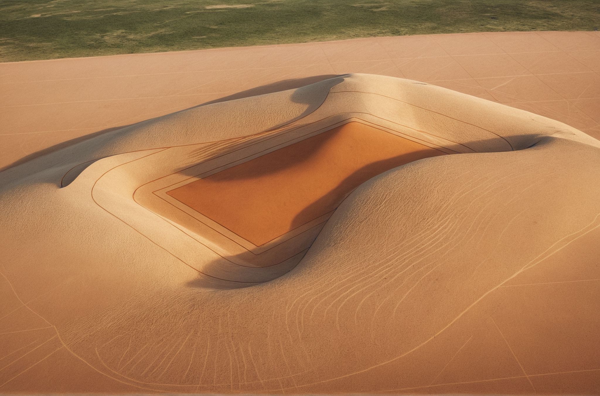 PromptA hyper-realistic, cinematic aerial view of a futuristic football field nestled within vast golden desert dunes. The rectangular field is covered in vibrant green grass, perfectly trimmed, and strikingly contrasted by the surrounding sculpted sandscape. Soft, sweeping dunes form natural amphitheater-like seating with organically flowing contours. The setting is during the golden hour, with warm sunlight casting dramatic shadows across the rippling sand, highlighting fine wind-blown textures and subtle tire trails. Sparse desert vegetation and several clusters of tall palm trees encircle the scene, blending nature with visionary architecture. Small groups of players and spectators are scattered around the field—some playing, others watching from the dunes, dressed in athletic or casual desert-friendly clothing. A light haze floats in the air, adding depth and realism, as fine sand particles drift with the wind. The atmosphere is peaceful yet energetic, capturing the fusion of sport, landscape, and design. Rendered in 8K ultra high definition, with photorealistic textures, cinematic color grading, and a subtle lens flare from the low sun. The image should feel like a still from a visionary documentary or sci-fi film rooted in realism.