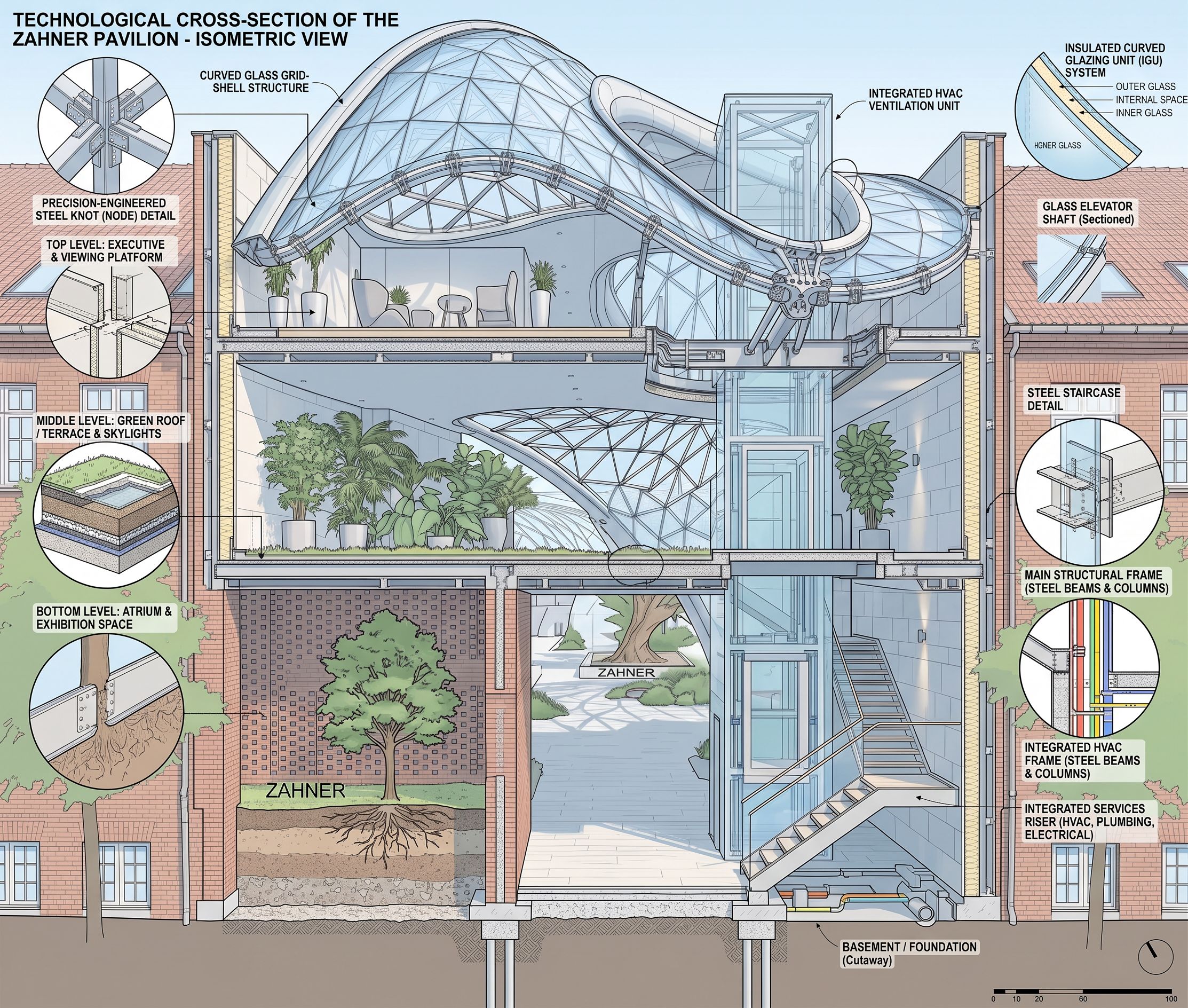 PromptCreate a technological cross-section drawing of this part of the building in this base image. Rotate the image and generate an isometric view. It also shows internal parts and technological connections., keep exact camera angle