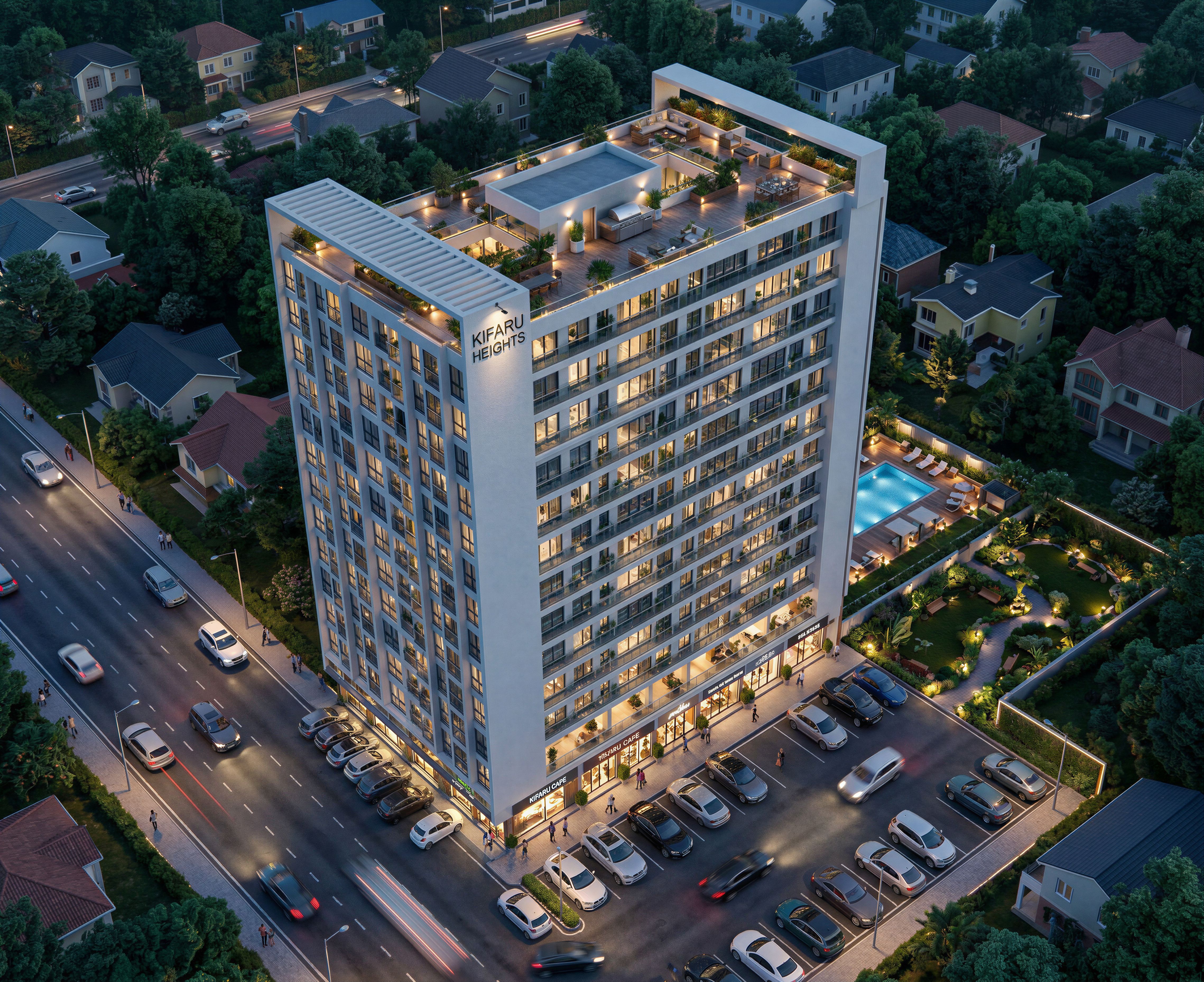 EnhancedPromptRender in a residential suburb. MAKE GLASS CLEAR, REALISTIC AND REFLECTIVE. PUT SHOPS ON GROUND FLOOR WITH PARKING INFRON ON THE SHORTER FACADE ONLY. USE PEARL WHITE WALL MASTER ON THE BUILDING.INCLUDE SOME SPOT LIGHTS, ROPE LIGHTS AND STREET LIGHTS IN THE BUILDING. TURN ON THE LIGHTS. s Write name"KIFARU HEIGHTS" ON THE BUILDING. MAKE IMAGE HIGH RESOLUTION 8K. PUT SHOPS ONLY ON NARROW FACE OF THE BUILDING FACING THE ROAD .INCLUDE BARBECUE, RECREATIONAL AND SITTING AREA ON THE ROOFTOP., keep exact camera angle. MAINTAIN ORIGINAL DESIGN AND LEVELS IN BUILDING. MAKE RENDER HIGH RESOLUTION FOR BILL BOARDS. INCLUDE A GARDEN SITTING AREA WITHIN THE NARROW EXTENSION CONNECTED TO THE BUILDING ON GROUND FLOOR., keep exact camera angle
