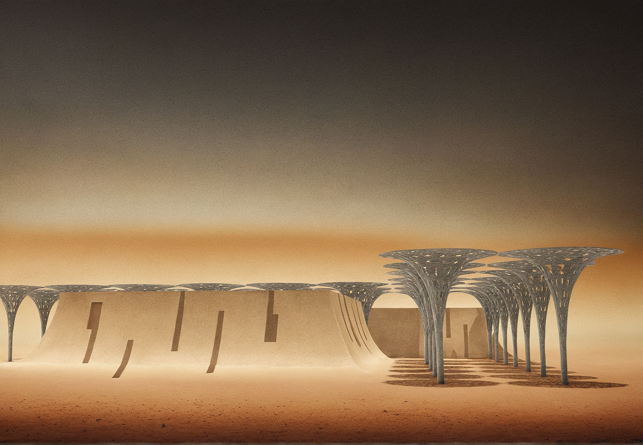 PromptA realistic architectural render showing a contemporary traditional-style building with a mud color. The structure includes a shading system made of perforated triangular-patterned columns and canopies with light grey steel structure material. The background features several tall palm trees under a clear desert sky. The ground is sandy, evoking a desert environment. Lighting is natural and warm, casting intricate shadows through the perforations onto the sand