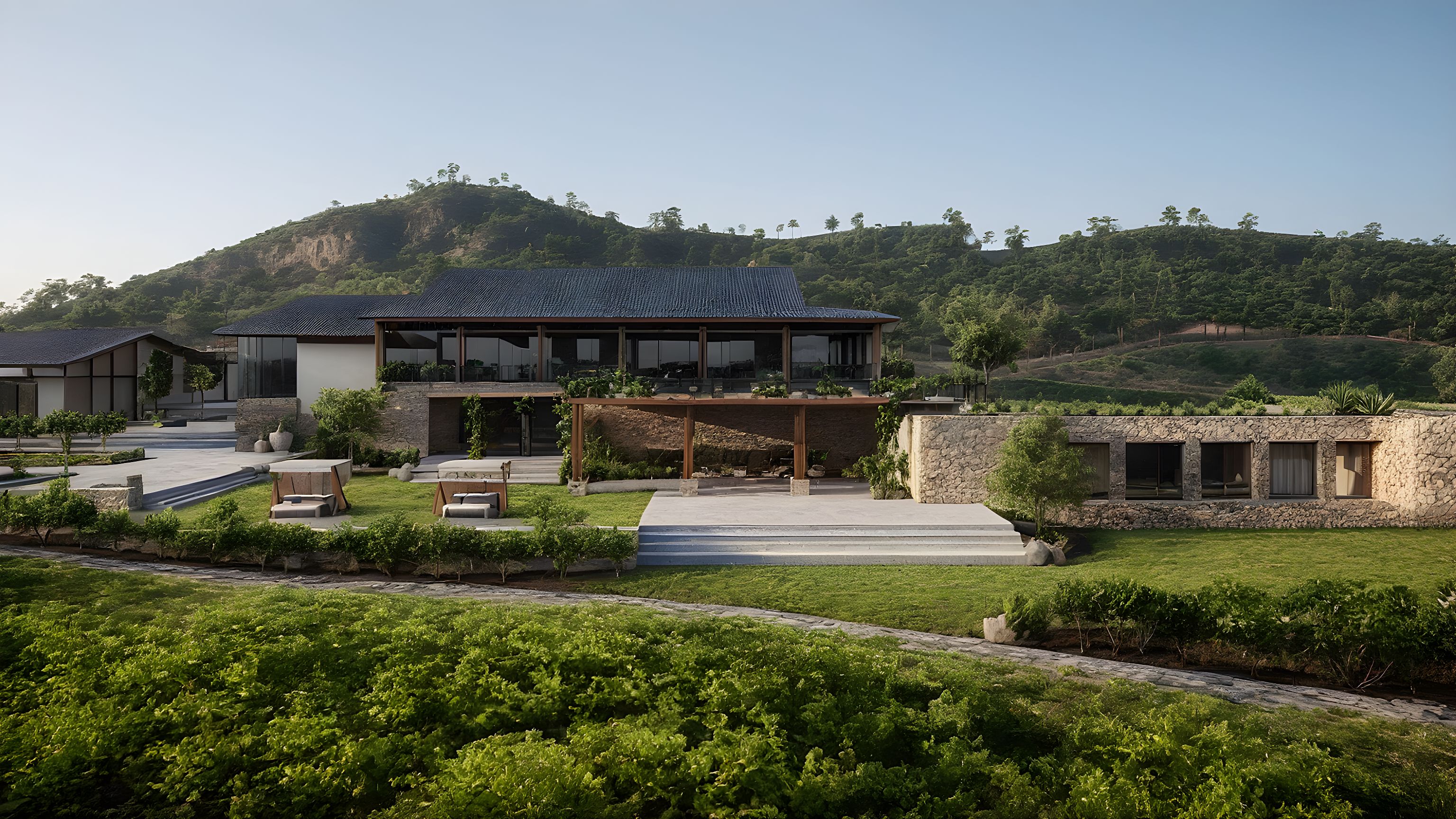 Promptthis is a winery, add vineyards and vegetation in the background to so that it looks contextual. Do not alter any materials of the architecture, leave that as is. Just add vines. The roof should be mangalore tiles, walls can be slightly rough lime plaster of cream colour. the structural members are of wood and the plinth of basalt