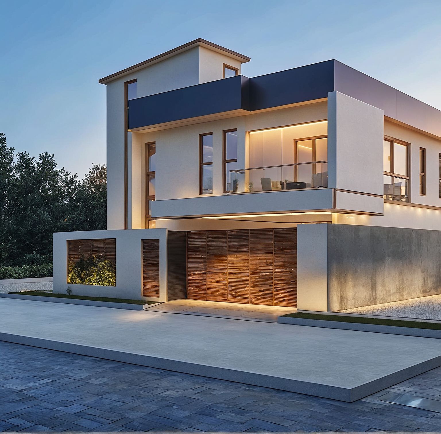 A modern single-family house on a sunny, peaceful day. The design features clean lines and minimalist architecture with materials like concrete, glass, steel, and natural stone. The color scheme includes white, grey, black, and cream tones. Natural sunlight highlights the textures and elegance of the facade. The setting is calm and harmonious, with no people or vehicles—just a serene, architectural scene under a clear blue sky.