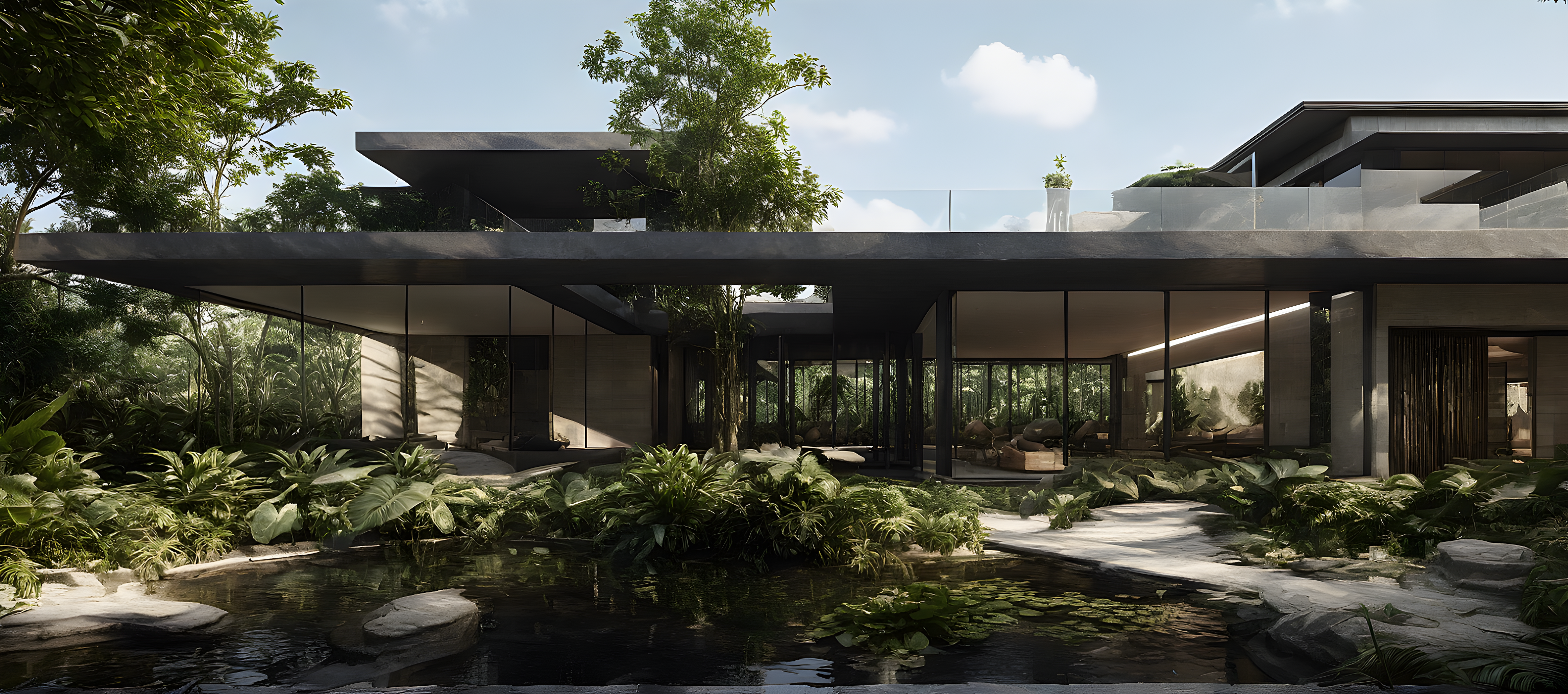 Promptdaylight mood rainforest environment minimal design dark grey metallic edge and column smooth beige limestone tropical garden with natural pond
