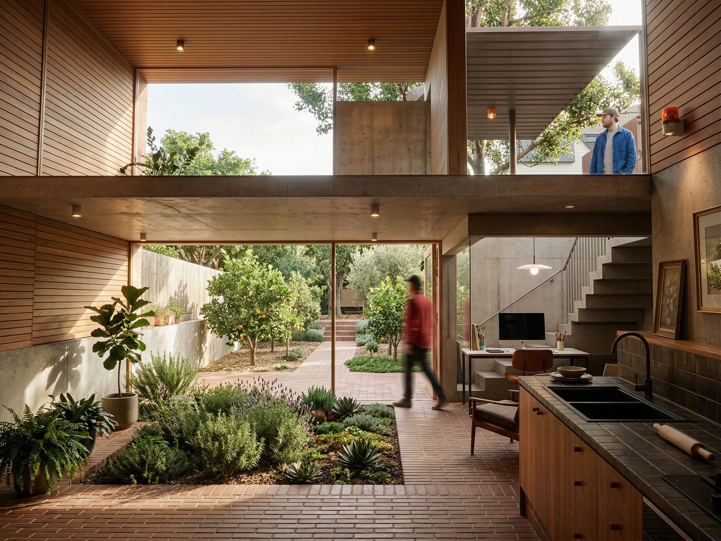 Promptinterior of a lower studio looking outside into a small orchard with a foreground sunken patio with a landscaped edge. Use existing view angle., keep exact camera angle