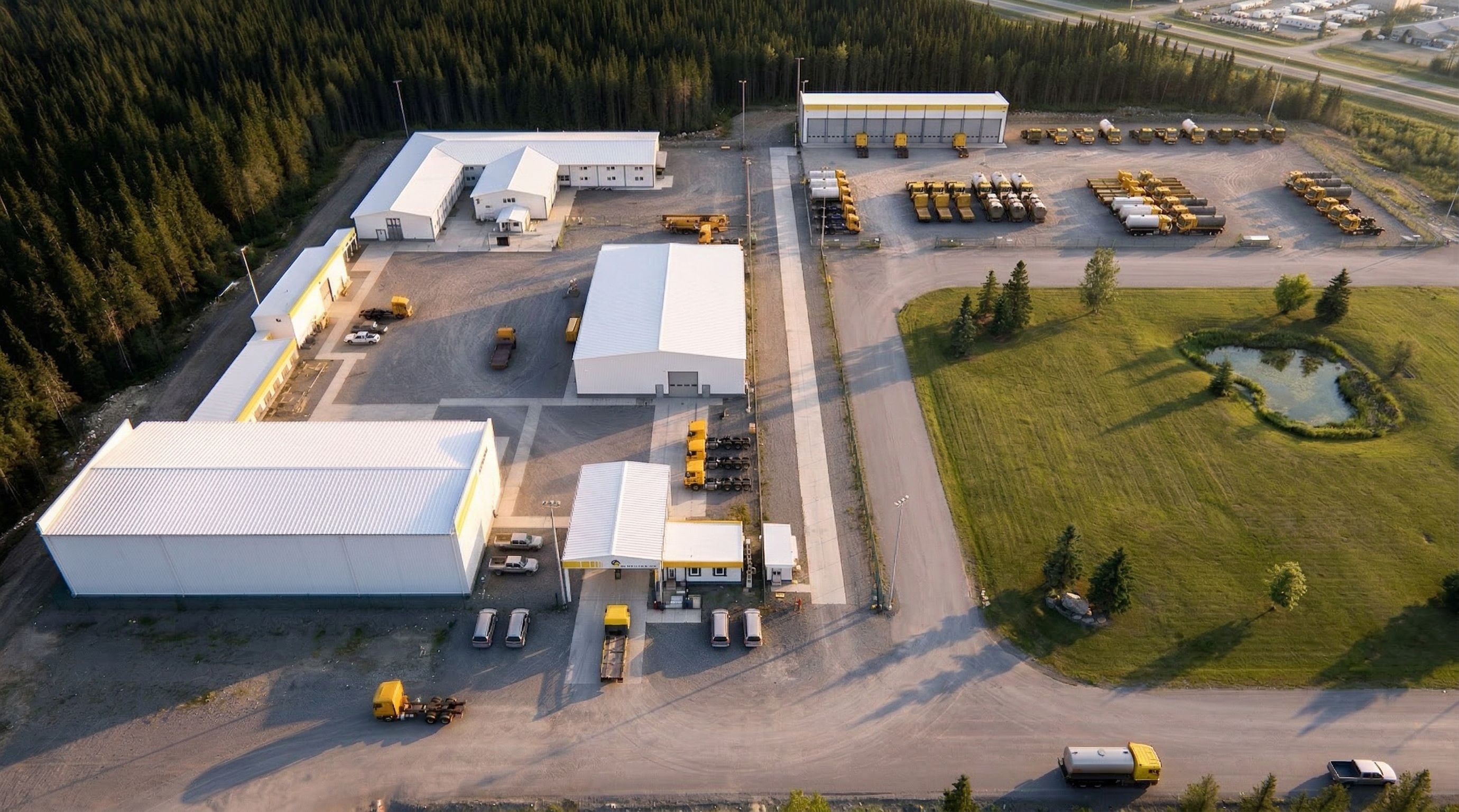 PromptHigh-quality photorealistic render. Photo of an industrial complex featuring multiple warehouse structures, characterized by flat roofs and large loading bays. Emphasizing metal cladding and clean lines, surrounding areas are paved for vehicle access, showcasing trucks in a neat arrangement. The scene is bathed in natural daylight, casting soft shadows across the ground. Aerial perspective highlights the orderly layout, with a wide-angle lens capturing the expansive site and its efficient operation. Brightly colored vehicles, predominantly yellow, create a striking contrast against the neutral building tones. Shed with a single slope. Roofing made of white filtered sheet., keep exact camera angle