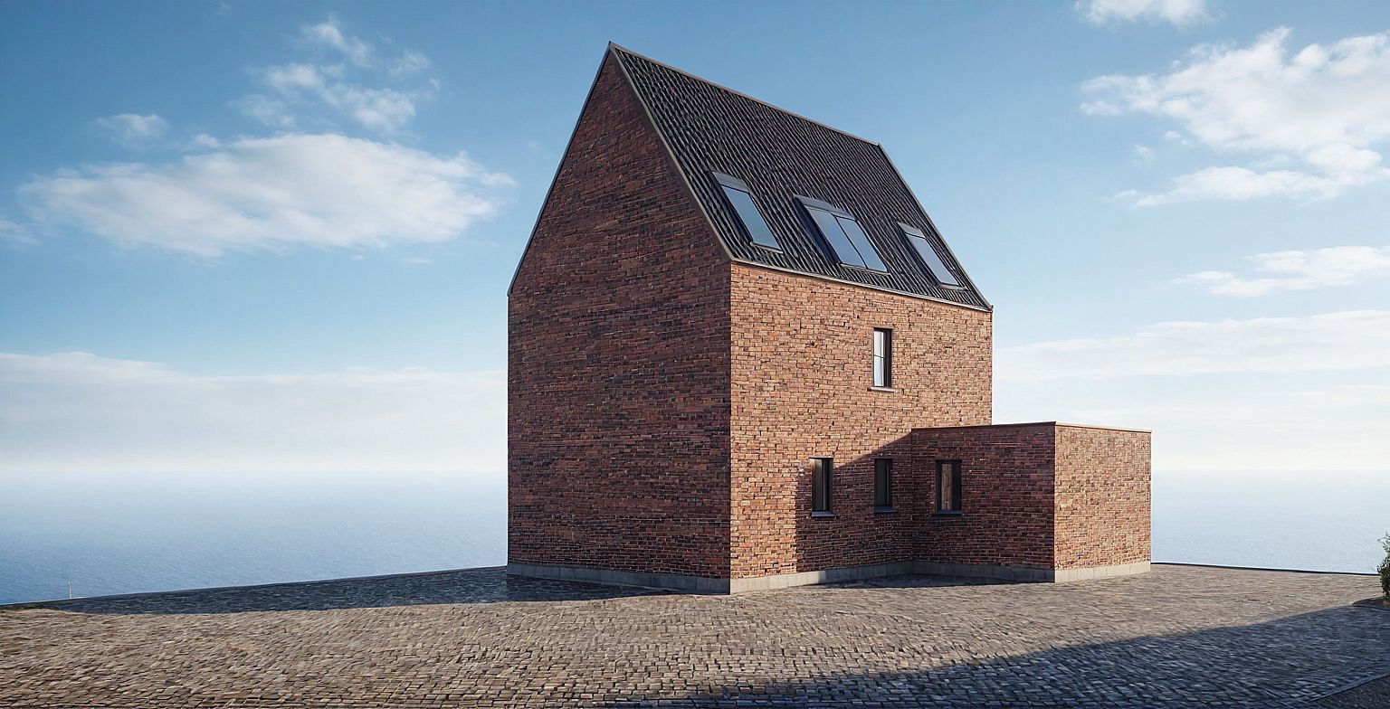 cinematic render, brickwall, big windows