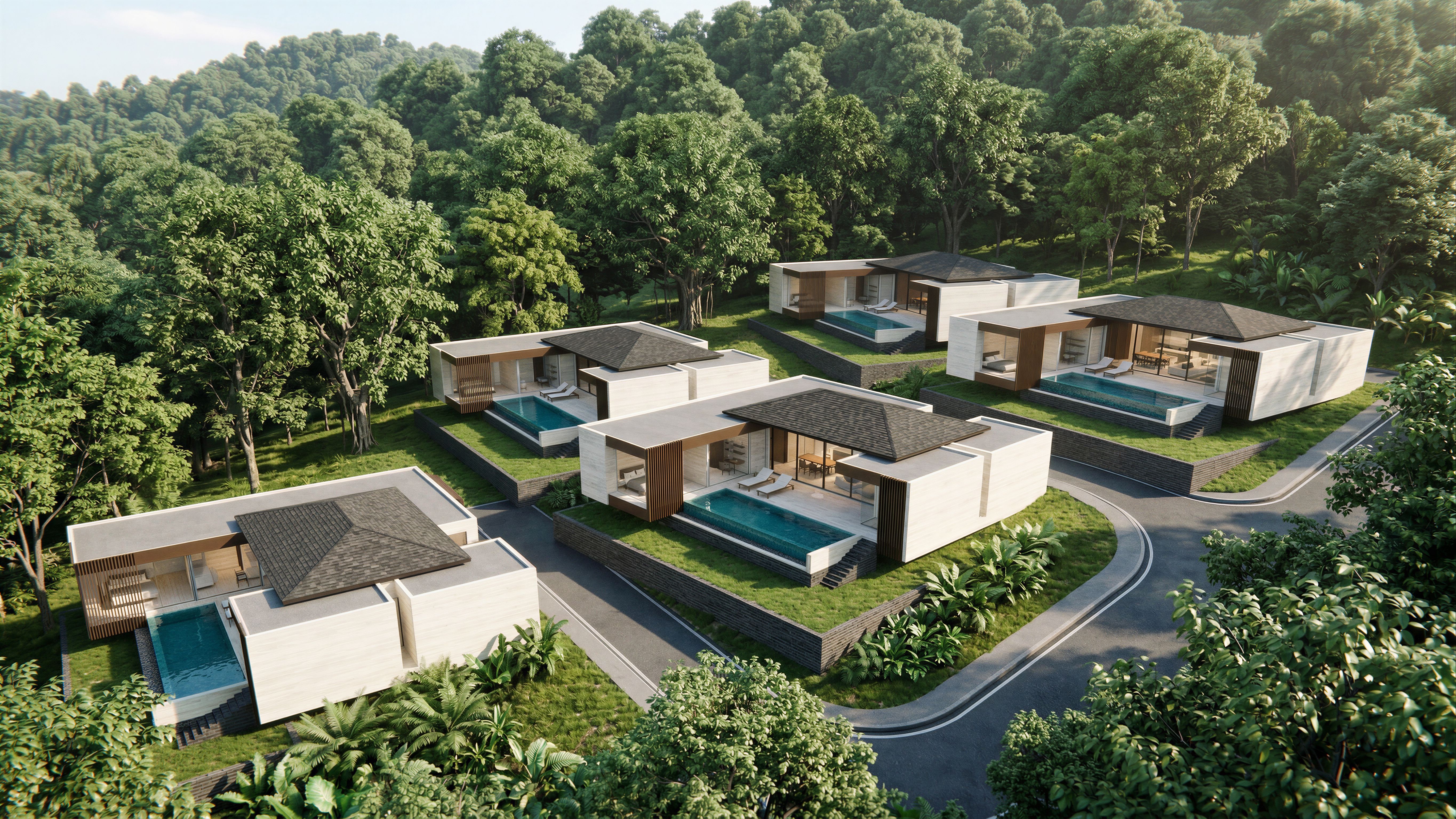 EnhancedPromptA photorealistic architectural rendering of an ultra-luxury minimal villa on a Koh Samui hillside. The design features a seamless use of White Travertine stone for walls and floors, extending directly into an infinity-edge pool. Structural beams and vertical slats are made of bronze. The building's base and retaining walls are constructed from dark grey bricks. Large Vitrocsa sliding window systems with ultra-slim frames reveal a central living/dining area flanked by bedrooms. The roof is finished with asphalt shingles and grey asphalt waterproof membrane for flat roofs. The very dark grey asphalt road leads to each villas along the green grass hill and tropical plants on the sideway. The villa is part of a tiered branded residence, stepped down the slope to ensure unobstructed panoramic sea views. The environment is lush with diverse tropical greenery and large native trees between villa plots and in the foreground and background. Bright, soft morning sunlight casts elegant dappled shadows across the grassy slopes. Note: Absolutely no coconut trees, only large native tropical foliage. 8k resolution, cinematic lighting., keep exact camera angle, keep exact camera angle, keep exact camera angle. The background view of this angle is the hills with dense of big tress., keep exact camera angle