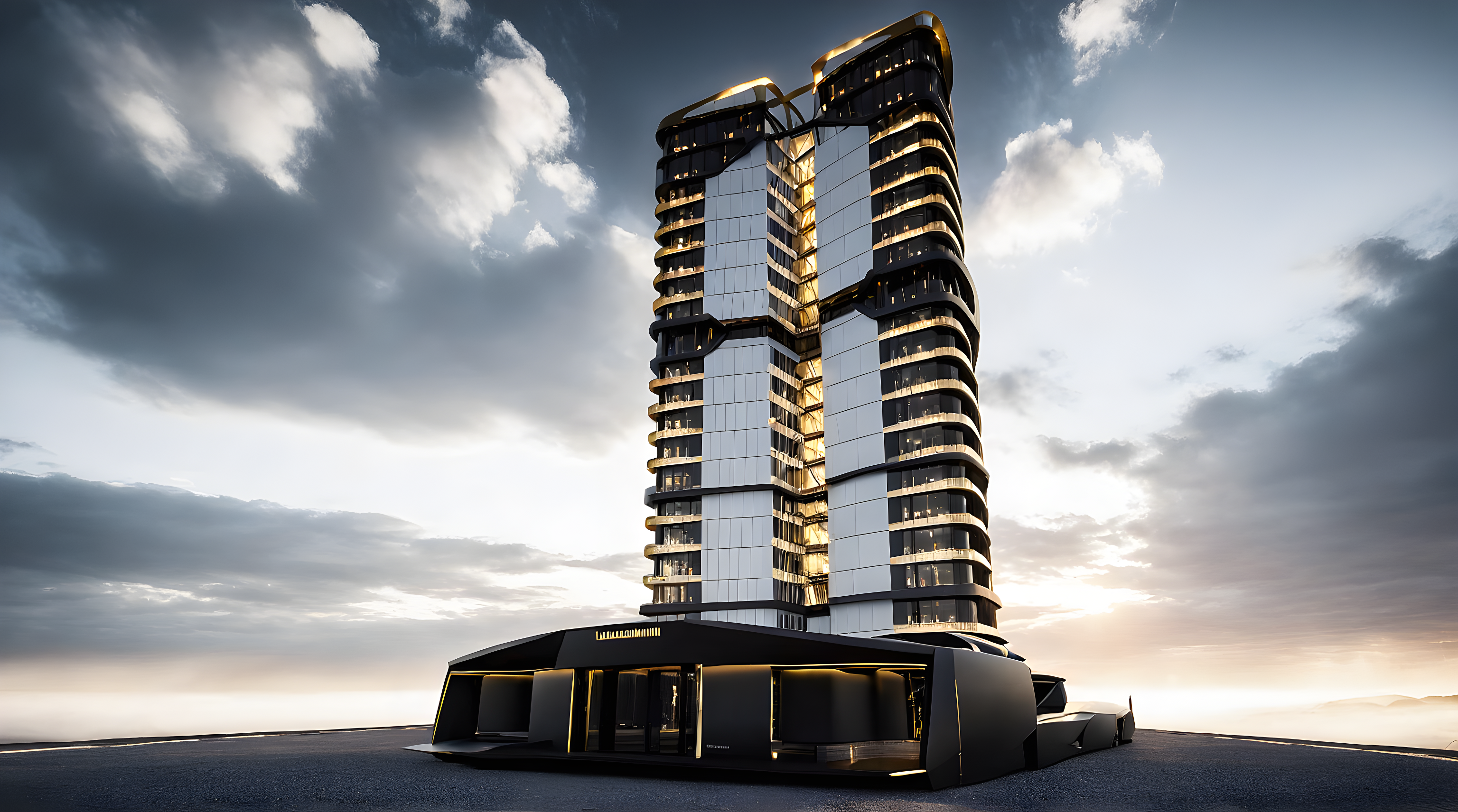 Enhance this image, black, gray and white. Lamborghini futuristic style, with golden lights enhancing the structure.