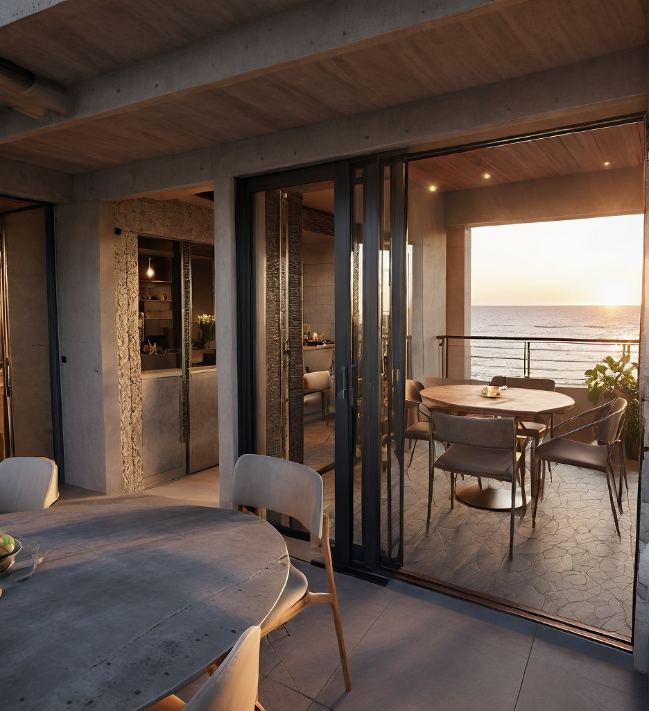 create a realistic image of a dining table and balcony of a modern and contemporary apartment at sunset, floor with concrete tiles