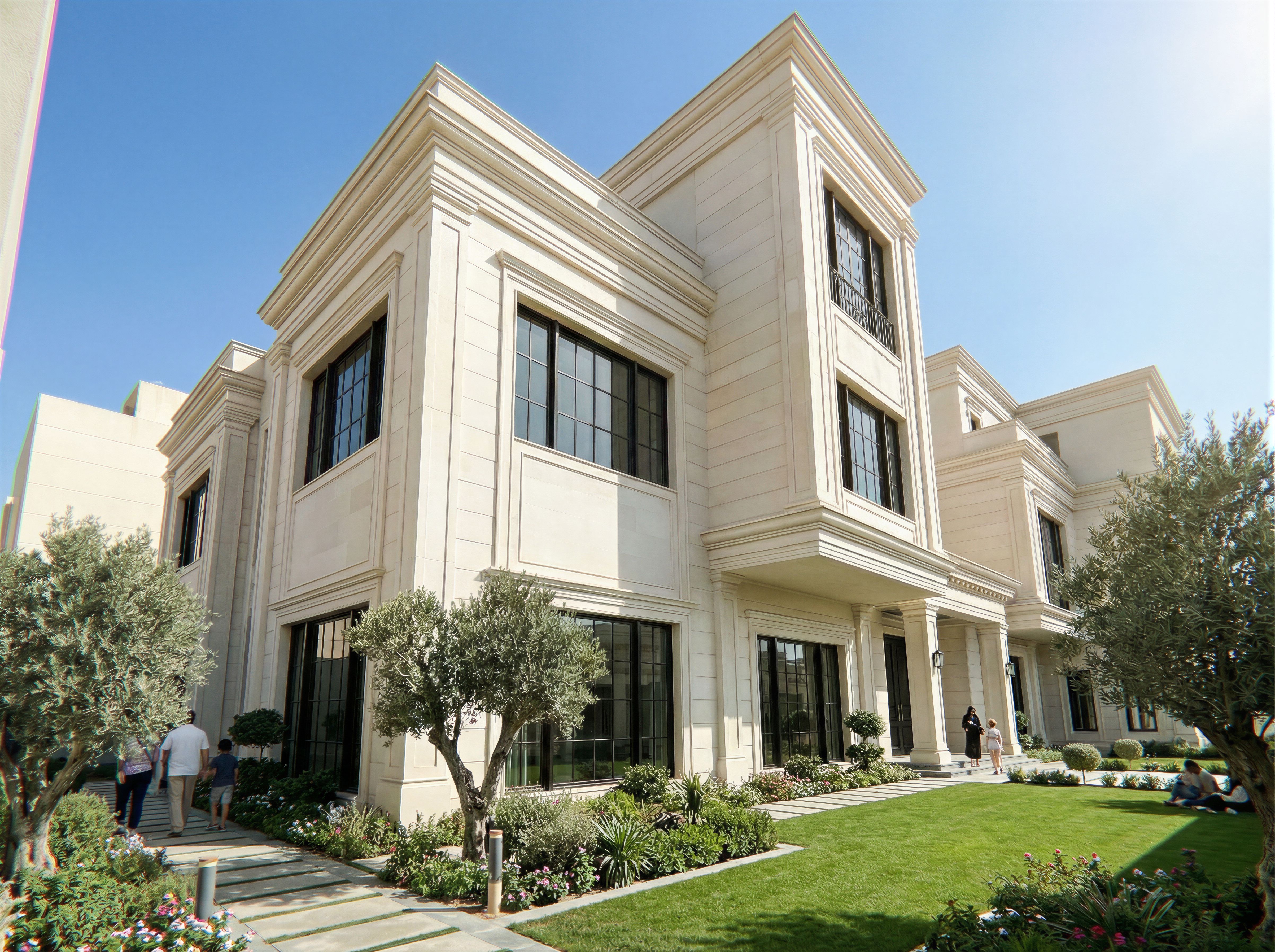 الصورة المرفقة للواجهة الجانبية لفيلا و في المرحع صورة امامية للفيلا و المطلوب عمل التصميم للواجهة الجانبية بما ينسجم ويحاكي التصميم في الواجهة الامامية, keep exact camera angle