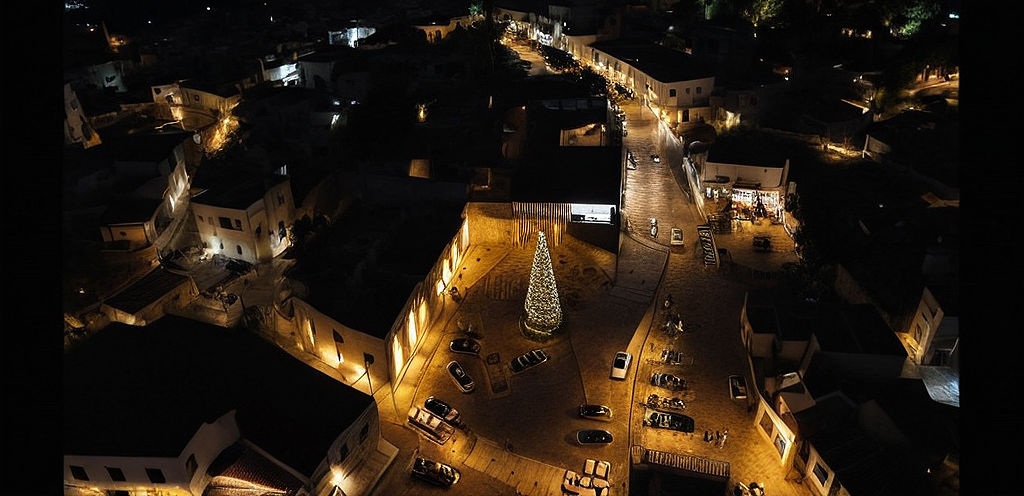 Promptold city of ibillin in the night, dont change geometry and city lights. Streets paved with ancient nazareth stone small tiles,poeple and families walking in the streets, lightened streets between buildings. Covering buildings with ancient nazareth stone, straight roofs of the buildings. christmas square in the middle with outside amphitheatre seats and stage with basement parking, red small food counters with alot of people along side of the christmas square.