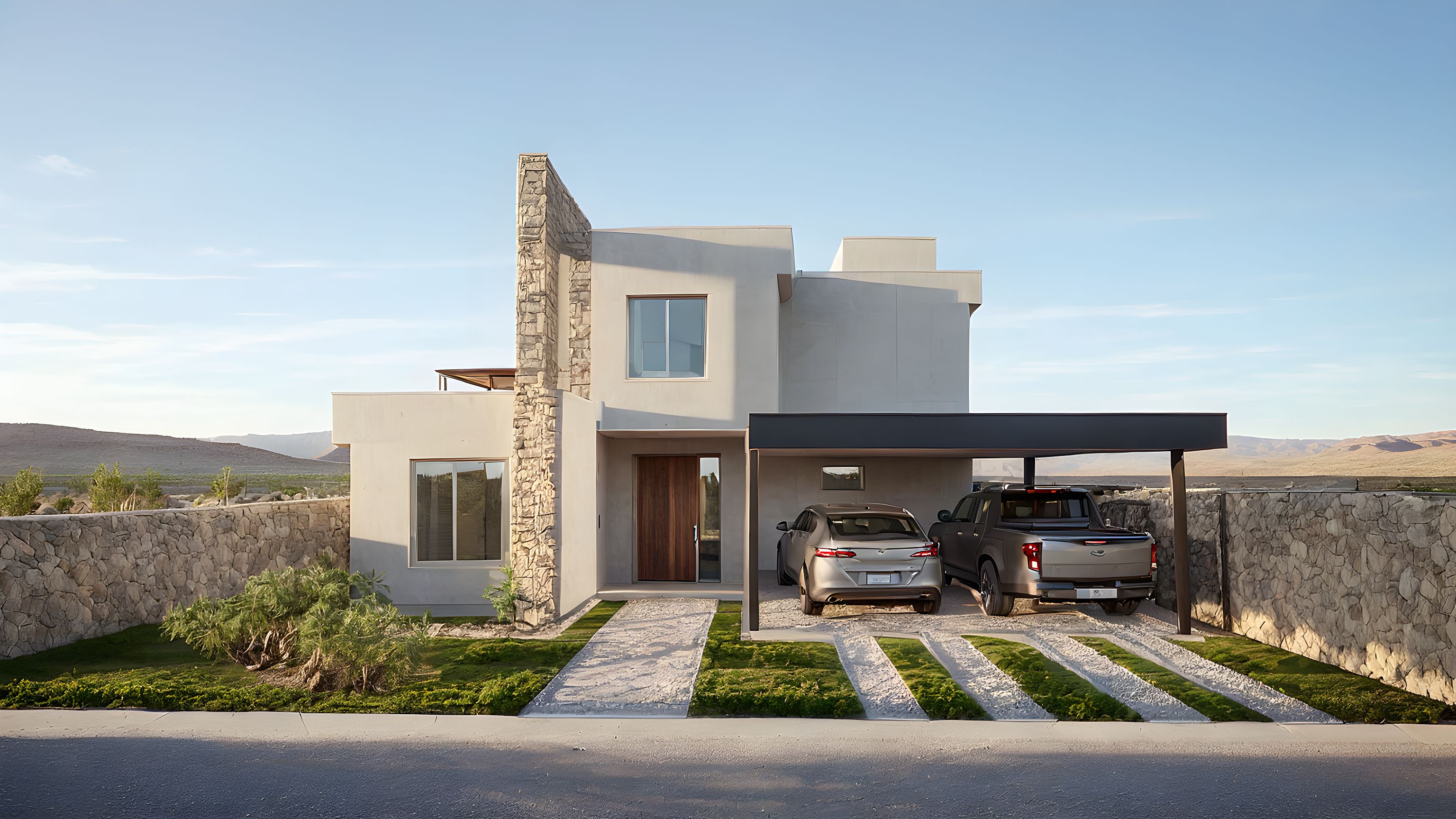 Photo of a modern residential home with a clean design, featuring a prominent stone accent wall and large windows. Surrounding elements include landscaped grassy areas and a stylish carport. Natural sunlight creates soft shadows on the façade while highlighting textures of smooth concrete and stone. Captured from a low angle to emphasize the structure's height and depth, showcasing the architectural features. The frame includes the driveway with parked vehicles, complementing the serene desert backdrop.