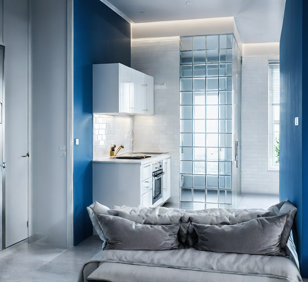 Promptcristal blocks, white kitchen, modern blue walls, gray floor, day natural light, bed