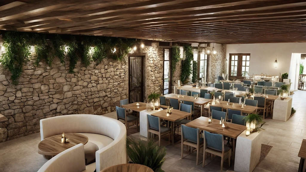 restaurant with a Greece style. Add monuments and plants