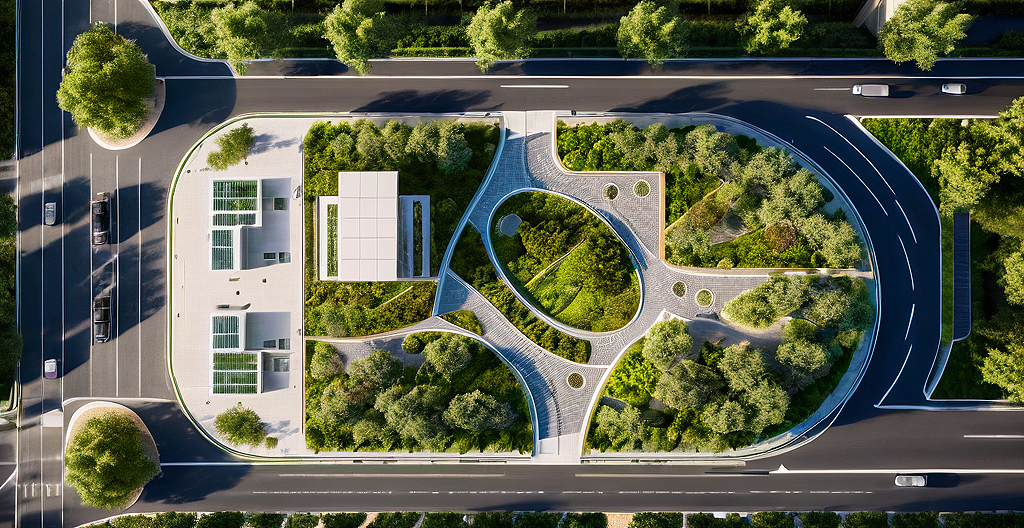 PromptOffice building, bank headquarters, sustainable architecture, environmentally friendly, simple shape, creating highlights, green architecture facade, green roof, light structure. Early morning rendering, warm stone