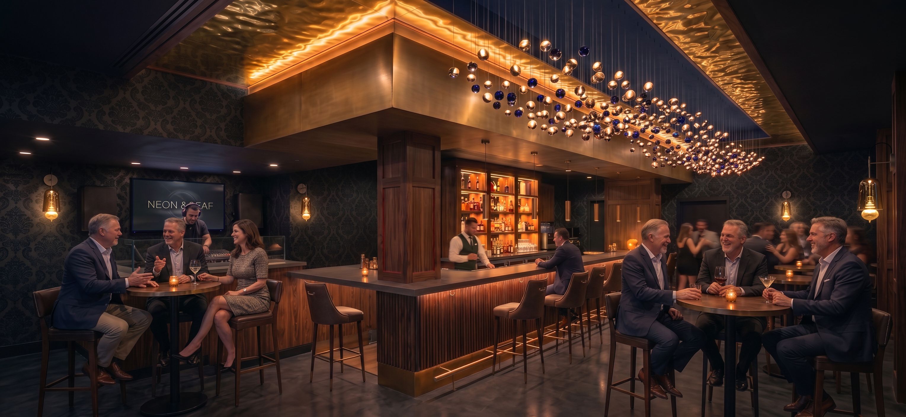Respeta el diseño el espacio y la arquitectura general de este proyecto sin cambiar el formato horizontal de ancho x alto y añade los siguientes cambios: Añade otra mesa en el lado izquierdo con tres taburetes y 2 hombres y una mujer de mediana edad, con ropa elegante pero más informal y respeta el resto de las personas de la imagen tal como están. Añade a los lados de las puertas negras del fondo las lámparas de pared de la imagen de referencia1 con luz cálida y tenue. Añade las lámparas de la imagen de referencia1 en la pared del lado derecho de donde está el DJ., keep exact camera angle