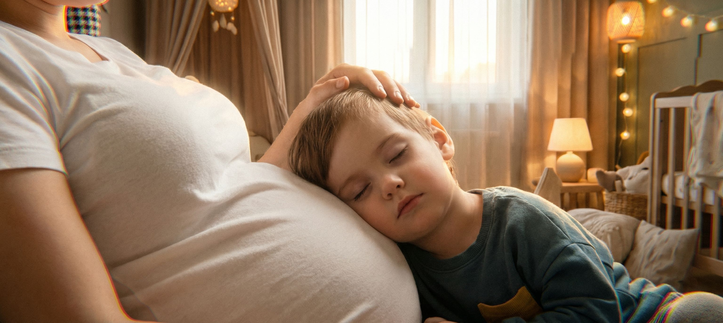 Create a newborn-style image, with this baby and the mother's growing belly depicted in a white T-shirt. The setting should be Ann Geddes-style. Use soft, dim lighting. Use image reference style., keep exact camera angle
