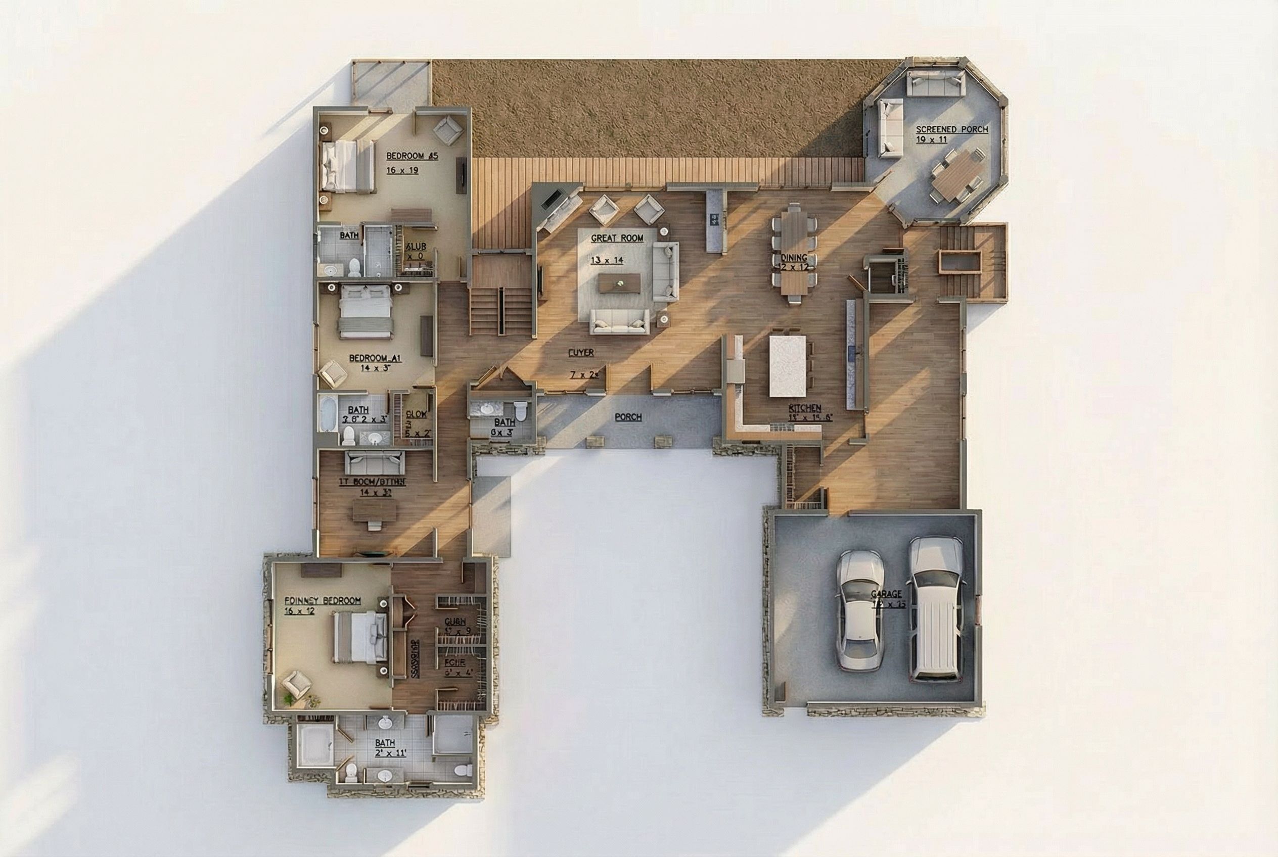 Promptarchitectural floor plan, render this drawing into photorealistic rendering, eliminate rear deck and eliminate bathroom next to kitchen. , keep exact camera angle, including furniture, technical annotations, material indicators, high quality, professional, detailed scene