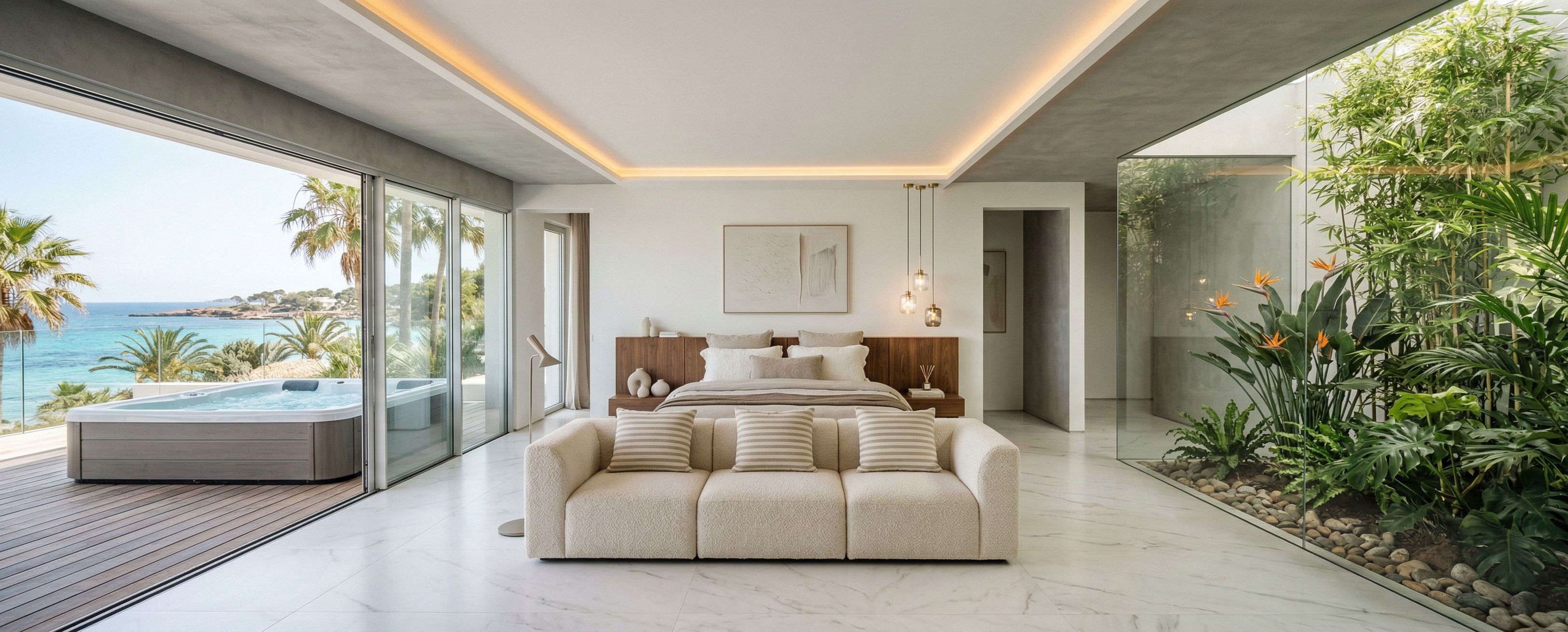 Photo of a modern bedroom suite featuring a stylish bed with fluffy pillows and a sleek sofa. The large glass walls invite natural light, highlighting the textures of soft fabrics and smooth wood finishes. The lush vegetation surrounding it adds an organic touch. Captured from a low angle to enhance spatial depth, with a wide-angle lens to encompass the open design and create cozy shadows, to the left there is an open terrace and a hot tub, the external landscape has a sea view framed by palm trees, the interior floor will be white marble, and the ceiling framed with perimeter indirect lighting.