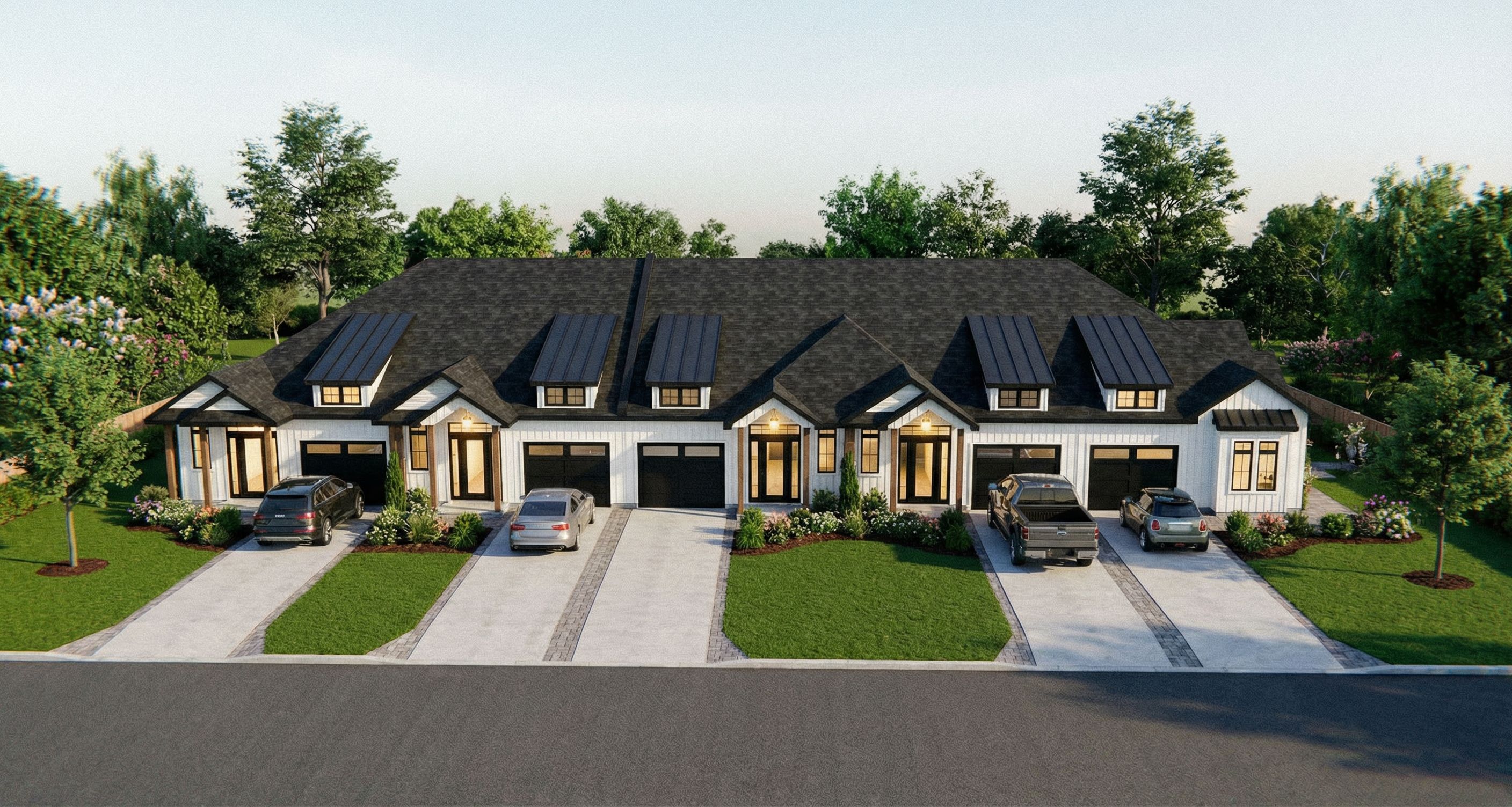 PromptPhoto of a modern duplex residential building featuring clean lines and a balanced facade. Emphasize the use of white siding contrasted with dark roofing, complemented by sleek black garage doors. The surrounding landscape includes manicured grass and a paved driveway. Natural daylight illuminates the structure, creating soft shadows that accentuate architectural details. Captured at a slightly elevated angle with a wide-angle lens, enhancing the sense of space and emphasizing the arrangement of the units., keep exact camera angle