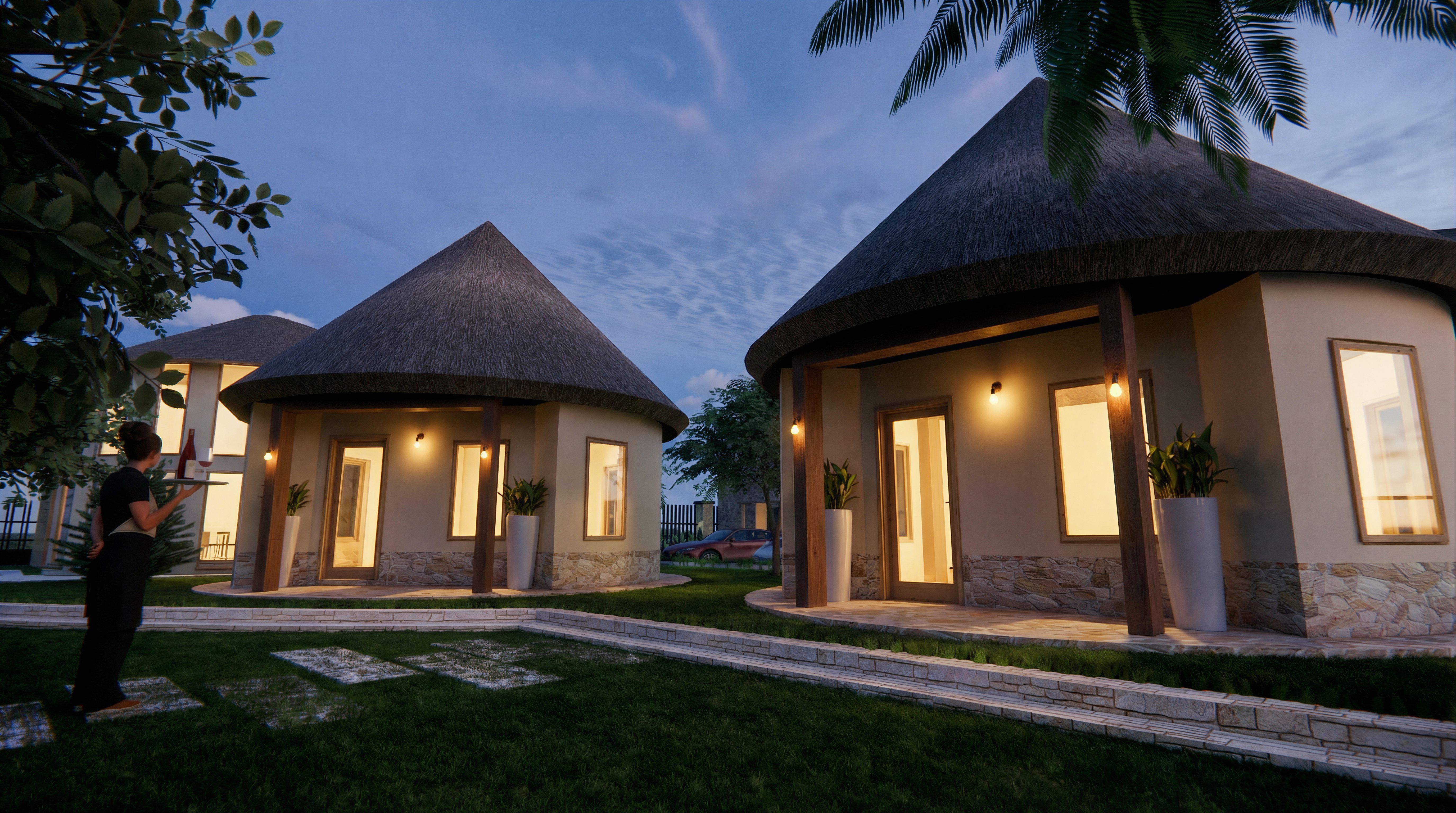 EnhancedPromptthese are cottage hut houses in a small resort, enhance the reed thatching roof and add some bit of warm lighting from a bulb inside the cottages with the light visible through the windows. add also a small light bulb on the outside entrance to the cottages, keep exact camera angle