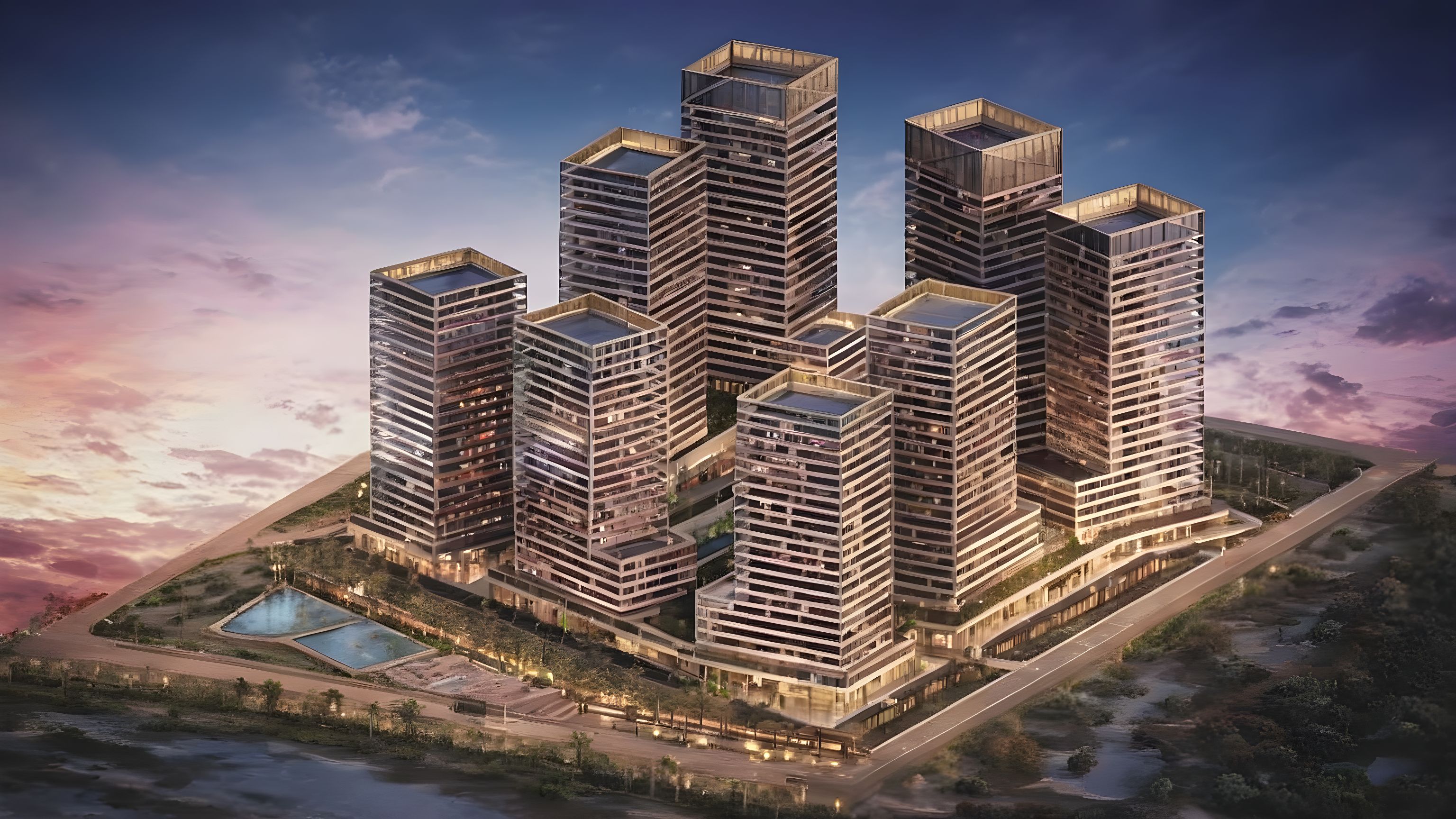 Photo of a modern urban complex featuring multiple high-rise buildings, showcasing sleek facades with glass and metal elements. The surrounding environment includes landscaped pathways and a bustling urban plaza, highlighting community engagement. Natural daylight illuminates the scene, casting soft shadows that accentuate architectural details. Captured from a low-angle perspective with a wide-angle lens, emphasizing the grandeur of the towers against the sky, with a lot of nature