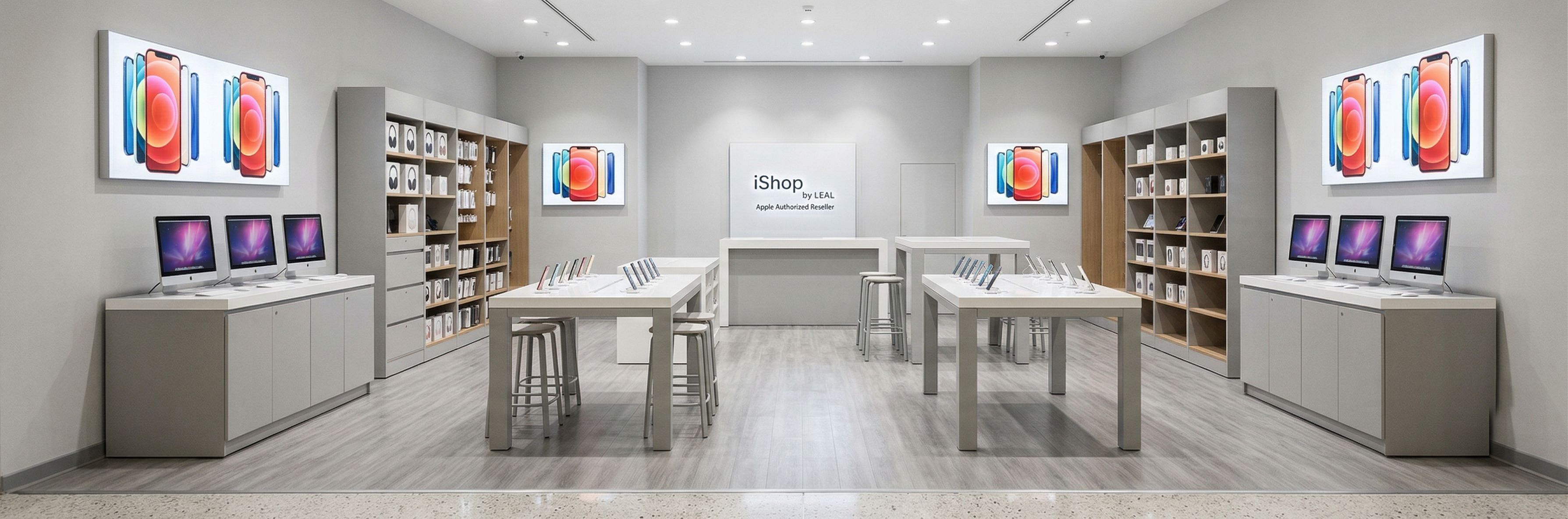 Prompt Photo of a modern retail space interior , apple shop , featuring sleek design elements with a focus on technology displays. Highlight minimalistic furniture with clean lines, al light grey furniture with white top, large digital screens( keeping the photo )on walls , and LVT light grey flooring. Urban setting with neutral colour palette and bright, daylight downlights on a flush white false ceiling ,creating soft reflections. Camera angle from a low perspective to emphasize depth, with a wide lens capturing the full expanse of the shop and its organized layout. Two Stools with light grey legs on each side of the high table. Keep counter white top and light grey colour, no POS .No modification to wall cabinet with accessories and low cabinet. No entrance door . Shop is located in a mall , keep exact camera angle