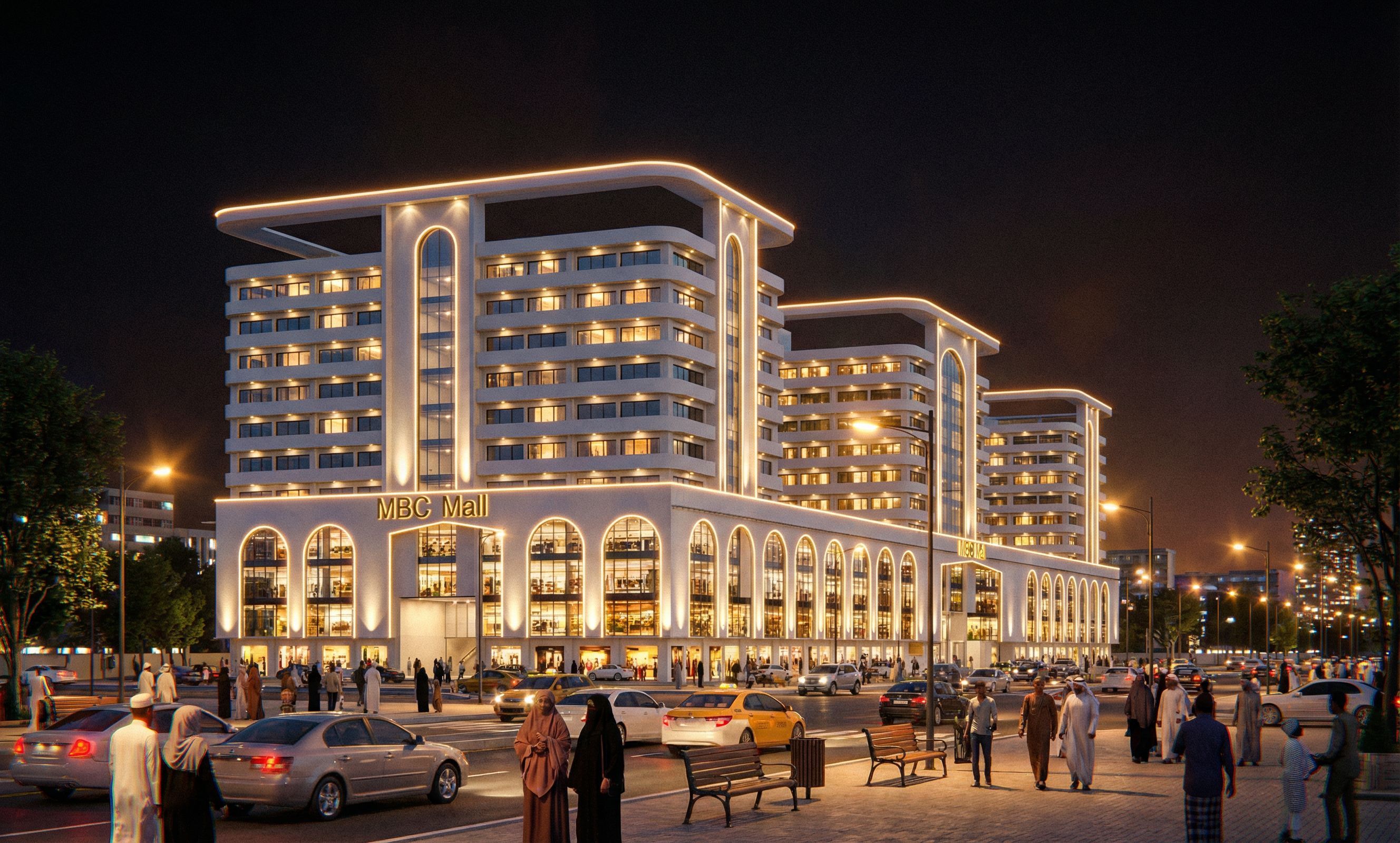 IMAGE SHOWING A MALL WITH GROUND FLOOR AND THREE COMMERCIAL FLOORS AND THREE TOWERS FROM 4TH TO 1OTH FLOORS. MAKE THE GLASS CLEAR REFLECTIVE AND REALISTIC. TURN ON THE LIGHTS IN THE BUILDING. INCLUDE ROPE LIGHTS, SPOT LIGHTS AND STREET LIGHTS IN THE BUILDING. THE PEOPLE ON THE STREET SHOULD BE OF SOMALI ORIGIN. USE WHITE WALL MASTER ON THE BUILDING. INCLUDE NAME "MBC MALL" ON THE BUILDING. , keep exact camera angle