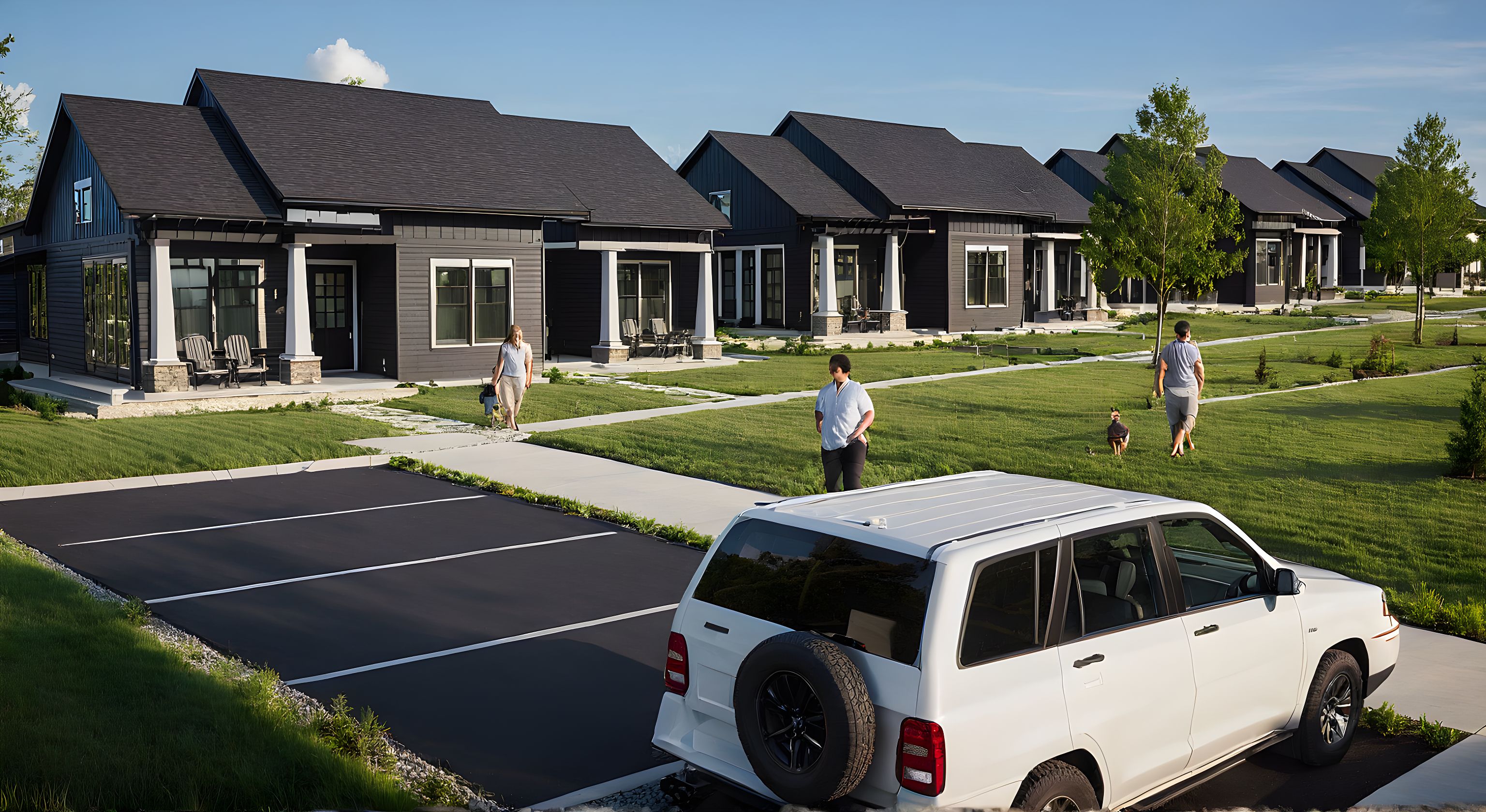 PromptPhoto of a row of modern duplex homes, showcasing distinctive architectural features such as gabled roofs, wide porches, and dark siding materials with white pillars. The urban setting includes landscaped green spaces and paved walkways, enhancing community feel. Soft morning light casts gentle shadows, highlighting the textures of the façades. Captured from a slightly elevated angle with a focus on the path and surrounding environment, using a standard lens to create a balanced composition that emphasizes both the homes and their outdoor space.