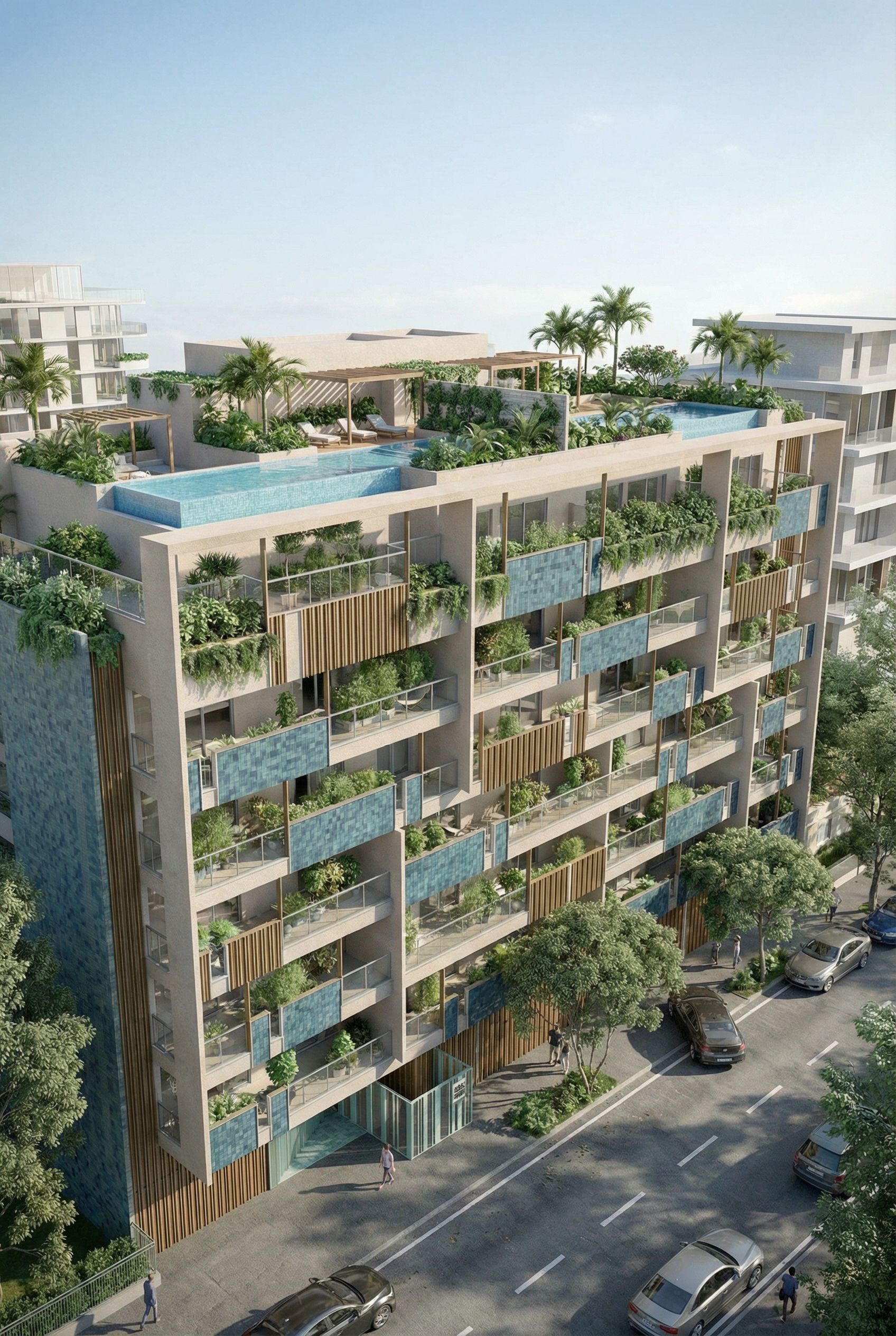 architectural exterior rendering, render this 3D mass into photorealistic rendering, Photo of a modern multi-story residential building featuring sleek glass facades and expansive balconies adorned with greenery. Surrounded by a landscaped urban setting, the structure stands out among nearby contemporary buildings. Bright, natural light highlights the architectural details throughout the day, casting soft shadows. Captured from a low angle, emphasizing the height and layout, with a wide lens to enhance perspective, showcasing the inviting environment and smooth road leading to the entrance., keep exact camera angle, bright daylight, natural lighting, including people, vehicles, greenery and vegetation, trees, high quality, professional, detailed scene