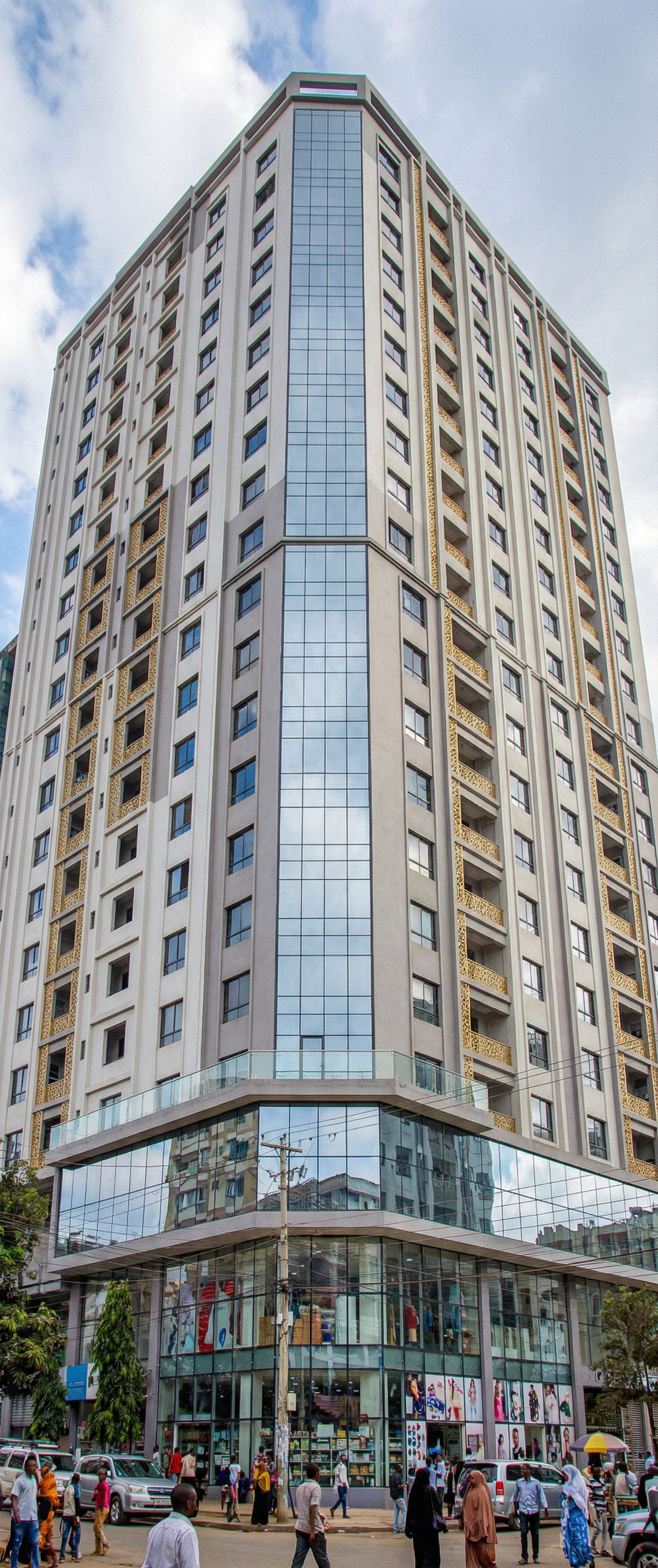 PromptIMAGE OF A 20 STOREY BUILDING WITH GROUND FLOOR, FIRST FLOOR AND SECOND FLOOR AS COMMERCIAL AND 3RD-20TH FLOOR AS RESIDENTIAL. MAKE THE GLASS APPEAR REALISTIC, CLEAR AND REFLECTIVE. USE THE COMBINATION OF THE COLOURS IN REFERENCE IMAGE 1 ON THE BUILDING. USE THE MASHRAYBYA IN THE REFERENCE IMAGE 2 ON THE BALCONIES RUNNING FROM TOP TO BOTTOM. USE CURTAIN WALLING ON FIRST AND SECOND FLOOR AND THE CORNER BETWEEN THE TWO FACADES . INCLUDE PEOPLE OF AFRICAN AND SOMALI ORIGIN IN THE IMAGE. SHOW THE WHOLE BUILDING. SHOW WHOLE BUILDING TO THE TOP. MAKE SECOND FLOOR COMMERCIAL WITH GLASS BALCONY. USE PASTEL GREY AND LIGHTER SHADES OF IT ON THE BUILDING., keep exact camera angle