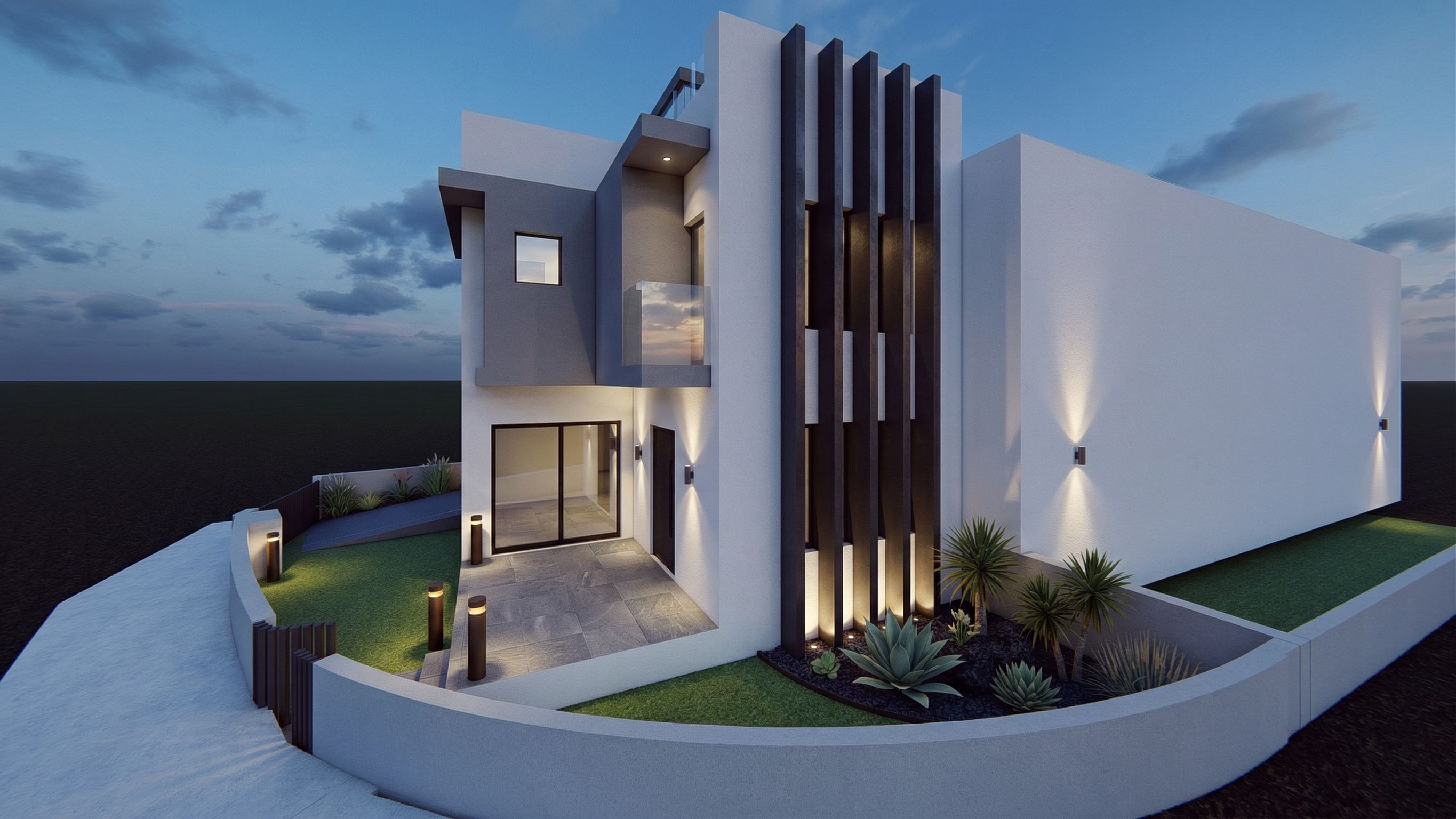Keep EXACTLY the same image, the same camera, the same viewing angle, the same framing, and the exact same architecture. Do not change the building form, the wall positions, the curved front boundary wall, the veranda/terrace, the ramp, the lawn, the heights, or any of the shapes. Do not redesign the house. Only make this exact image more photorealistic. What to add: Turn it into a photorealistic architectural visualization. Add a few elegant exterior lights: subtle wall lights on the walls, low warm bollard lights inside the yard, hidden uplighting on the vertical black architectural elements. Add a small amount of modern landscaping only: in the planting beds on the right, and a little at the back/left side only where the design allows, not too much, not on the veranda/terrace, not on the ramp. Very important: Keep the veranda/terrace exactly as it is, at the same height, same size, and touching the wall exactly as in the original. The veranda must remain clean, flat, elevated, and unchanged in shape. Keep all the grey built architectural elements exactly as they are. Improve only: plaster/render textures, floor tile materials, glass realism, metal finishes, shadows, and a realistic dusk / evening lighting atmosphere., keep exact camera angle