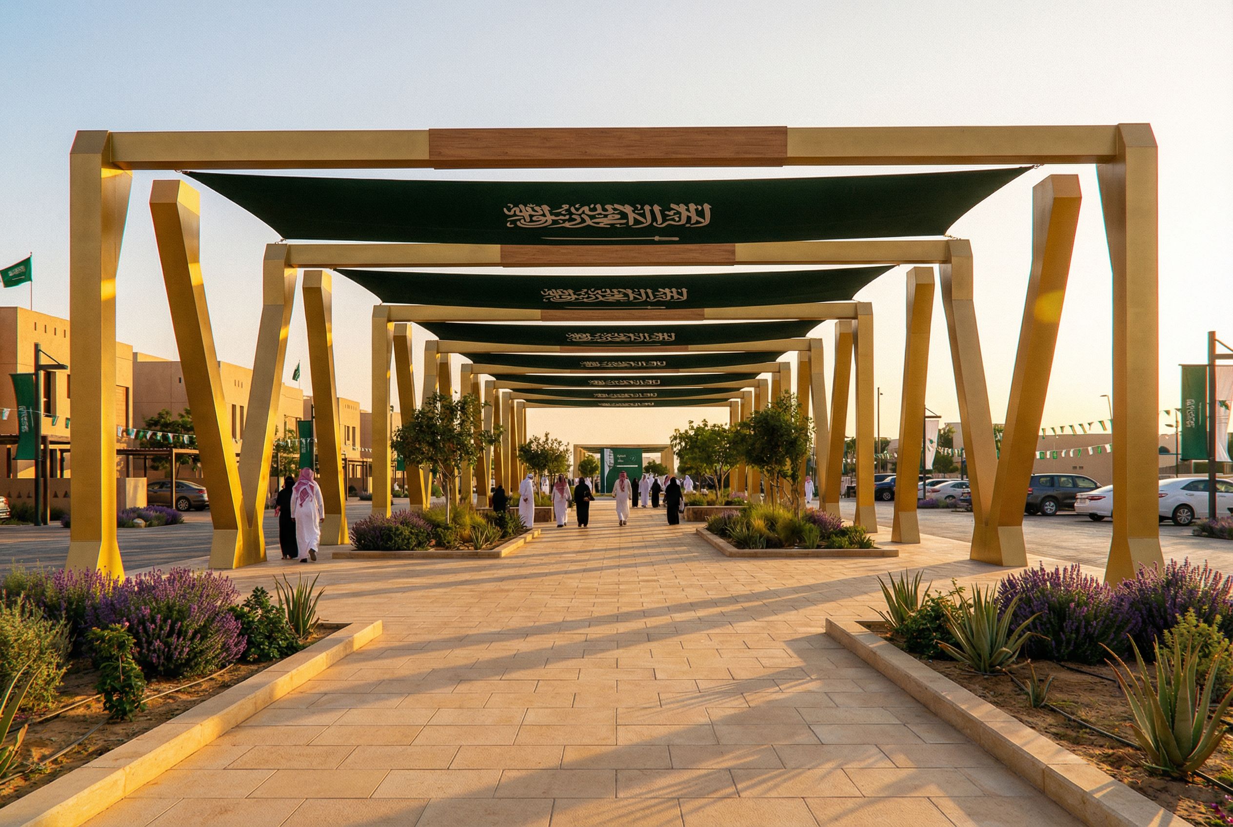 WALK WAY ON plaza in Roshn sedra district like reference image , Riyadh stone , BLACK IS SAUDI FLAG , Saudi national day celebrations, keep exact camera angle