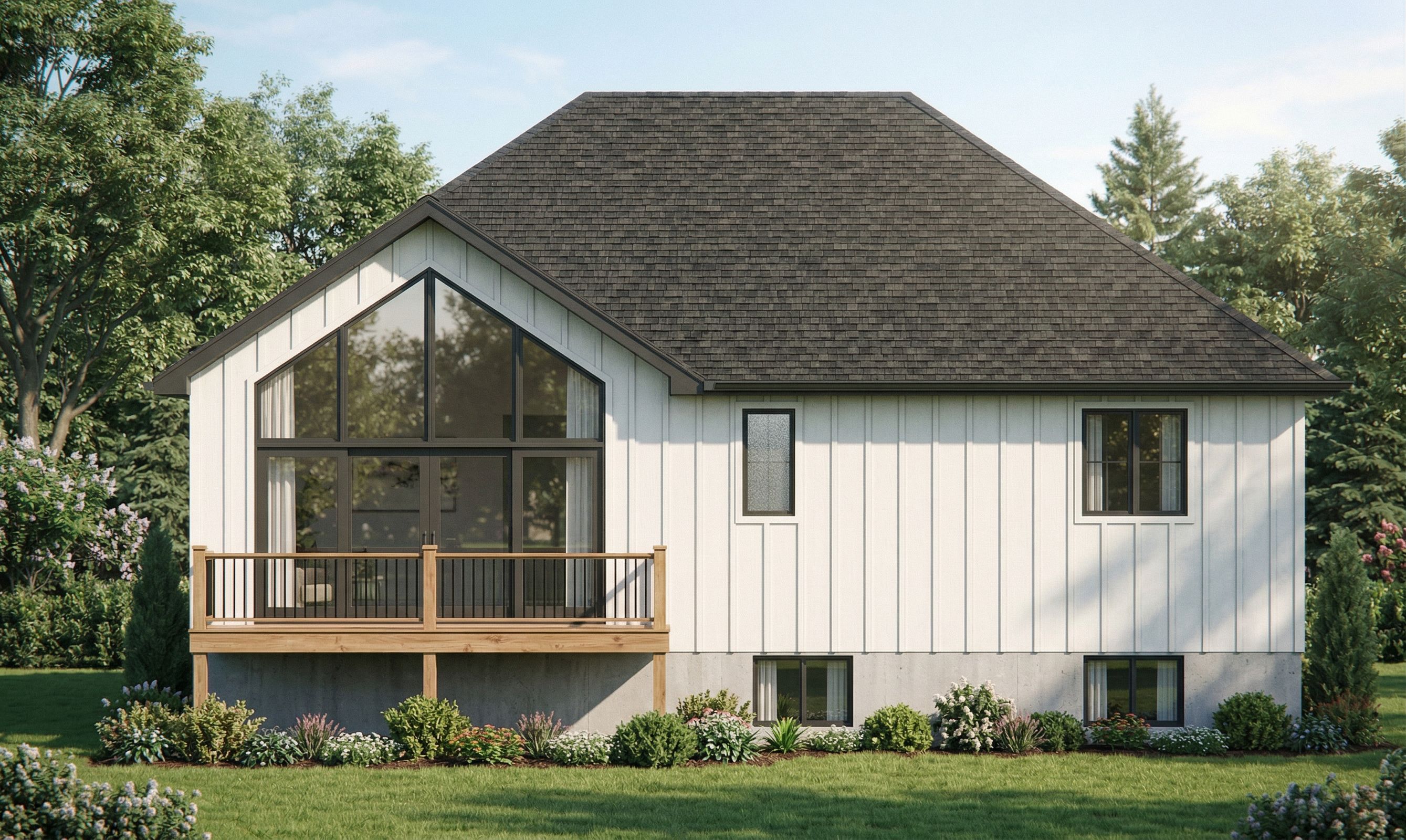 A modern residential rear elevation, showcasing an uncovered sundeck with wood railings and black aluminum spindles, match the style and landscaping of the reference image, frost the small rectangle window, no stone just concrete foundation wall shown below the siding , keep exact camera angle