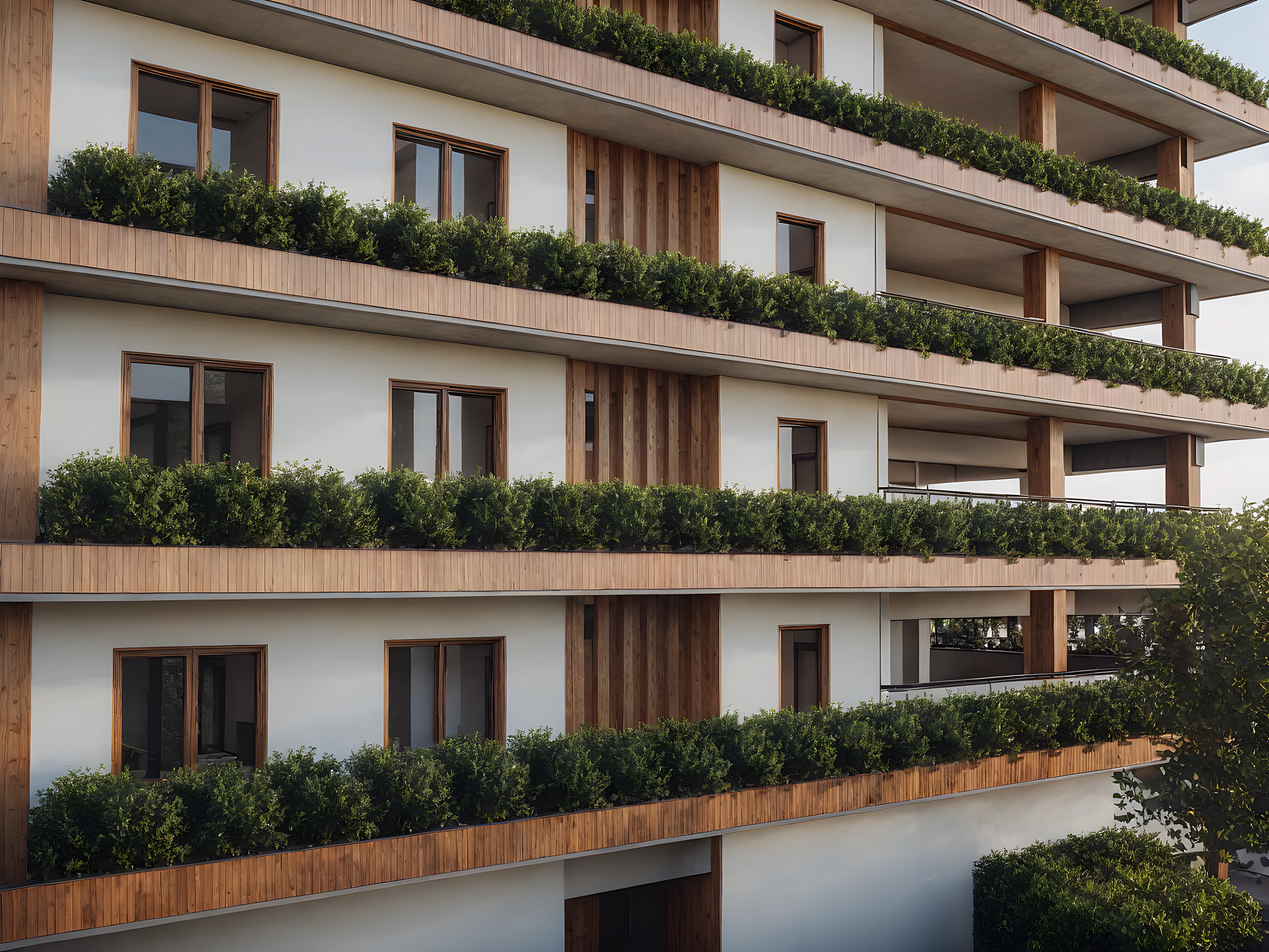 Promptbuilding details, with bushes around each floor, wood columns and panels