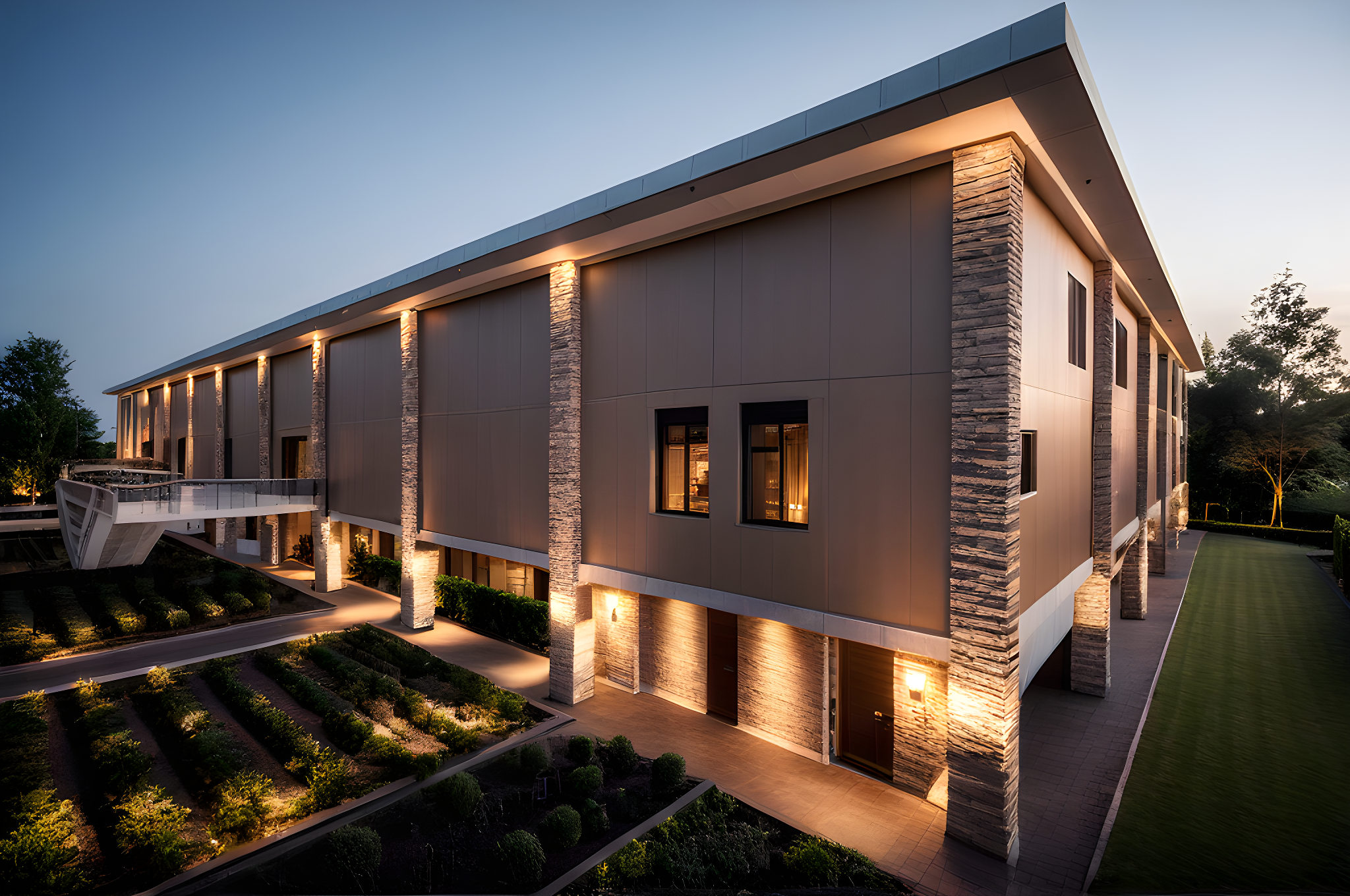 PromptThe top half of the building has light brown aluminum panels. The columns are made of stone and the bottom level has two brown double doors. There is a garden in the front yard.