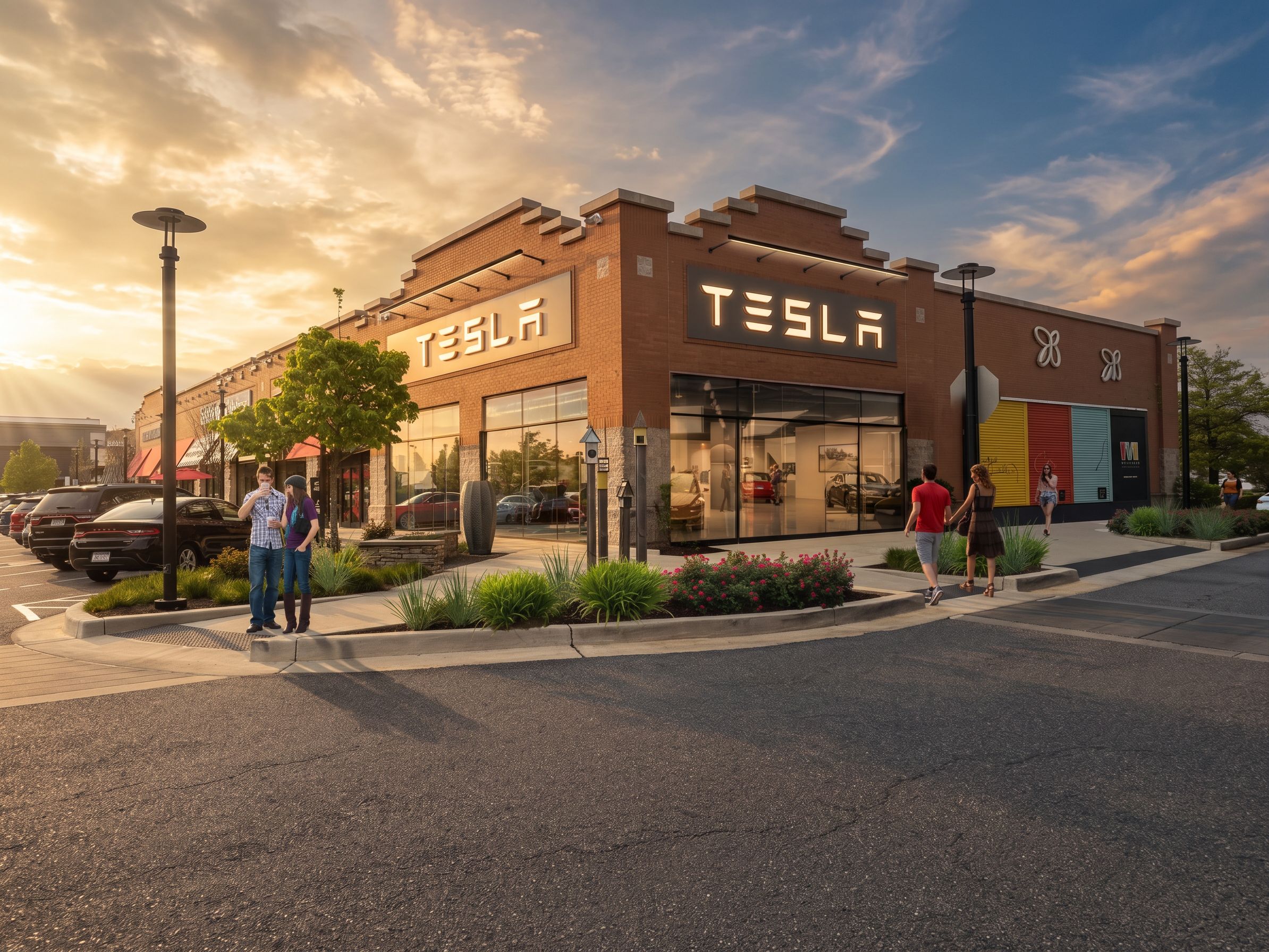 Photo of a modern retail building featuring a prominent Tesla storefront, emphasizing brick and glass materials, sleek lines, and dynamic shapes. Set in a vibrant urban shopping area, surrounded by lush landscaping and ultra modern storefronts. Natural lighting during late afternoon creates soft shadows and highlights. Perspective captures an inviting street view with pedestrians interacting, framed by green plants and decorative elements, using a wide-angle lens to enhance depth and engagement. Keep the camera angle, soft sun rays coming from the left of the image. create soft shadows on peoples, keep exact camera angle