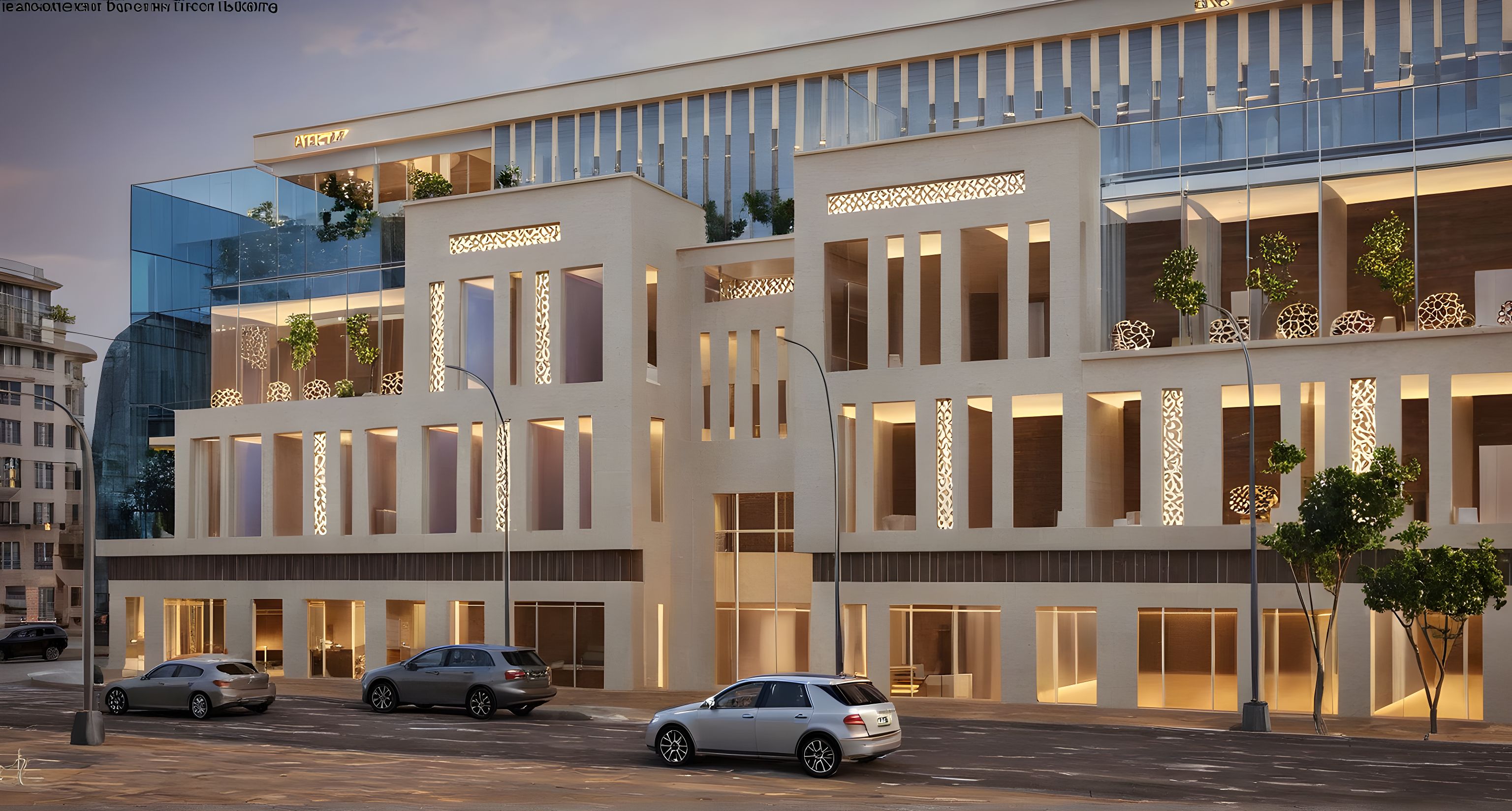PromptEnhance the photo and make it look more realistic, but do not change the design. The building should follow the Salmani architectural style. Apply Riyadh stone texture in beige color, taken only from the provided photo, and keep the stone smooth and intact (not broken). Preserve the windows with their white Najdi pattern exactly as they are. Keep the wooden strip at the bottom as it is. Make the curtain wall one single slide without division walls, and ensure the glass extends all the way to the bottom, same as in the reference photo. The entrance should be a combination of stone and glass. Use the same night scene lighting as in the reference. Use the same glass style as in the reference, making sure the glass looks clear, reflective, and elegant. Make the road realistic