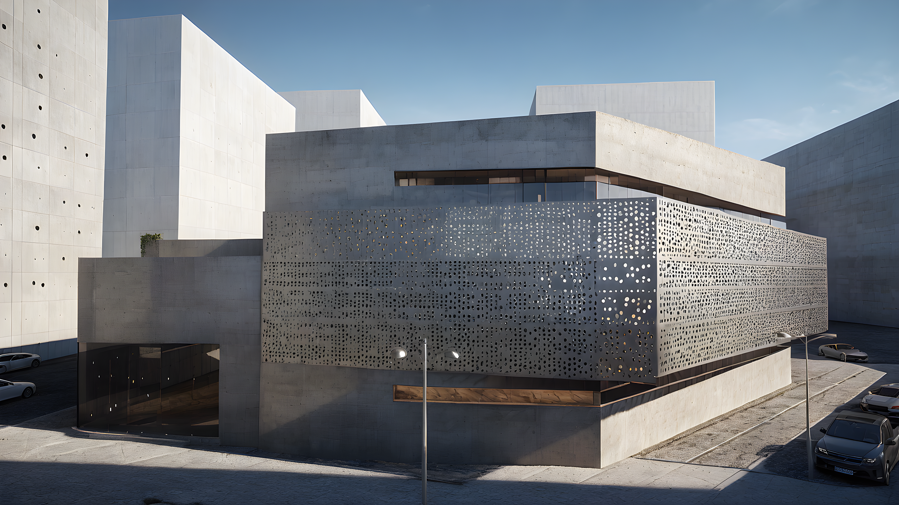 Promptfacaide of poilished concrete and a metalic panel with rectangular holes