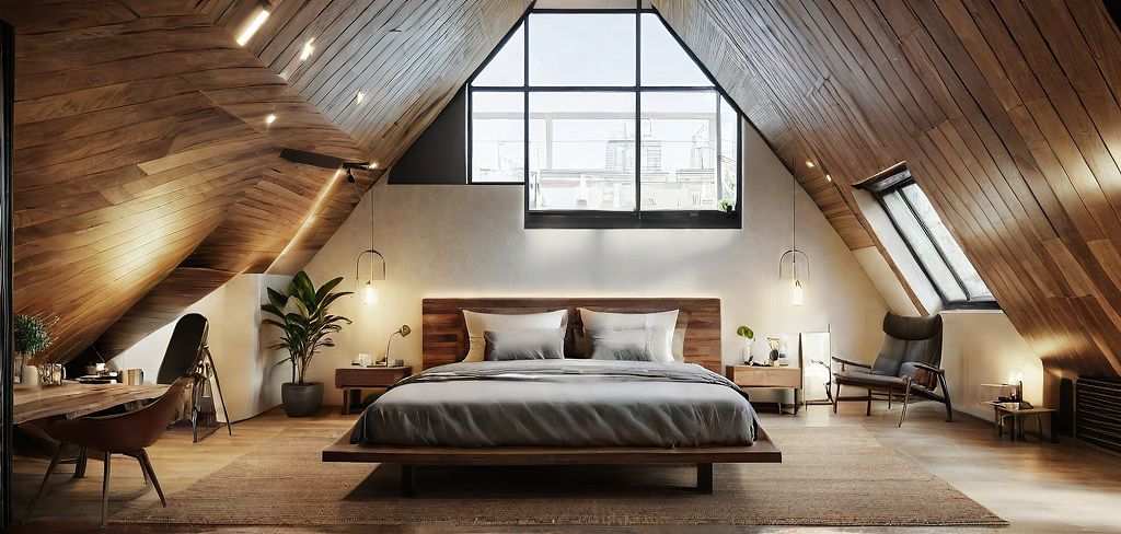 Photo of a modern loft space featuring a sloped roof and expansive windows. Emphasize the interplay of wood textures on the ceiling tiles and the minimalist design of the wooden bed frame. Set in an urban context, with soft morning light pouring in, creating gentle shadows on the polished floor. Capture a high-angle perspective through a wide lens to showcase the spaciousness and height of the room, with a focus on the clean lines and balance of elements within the interior.