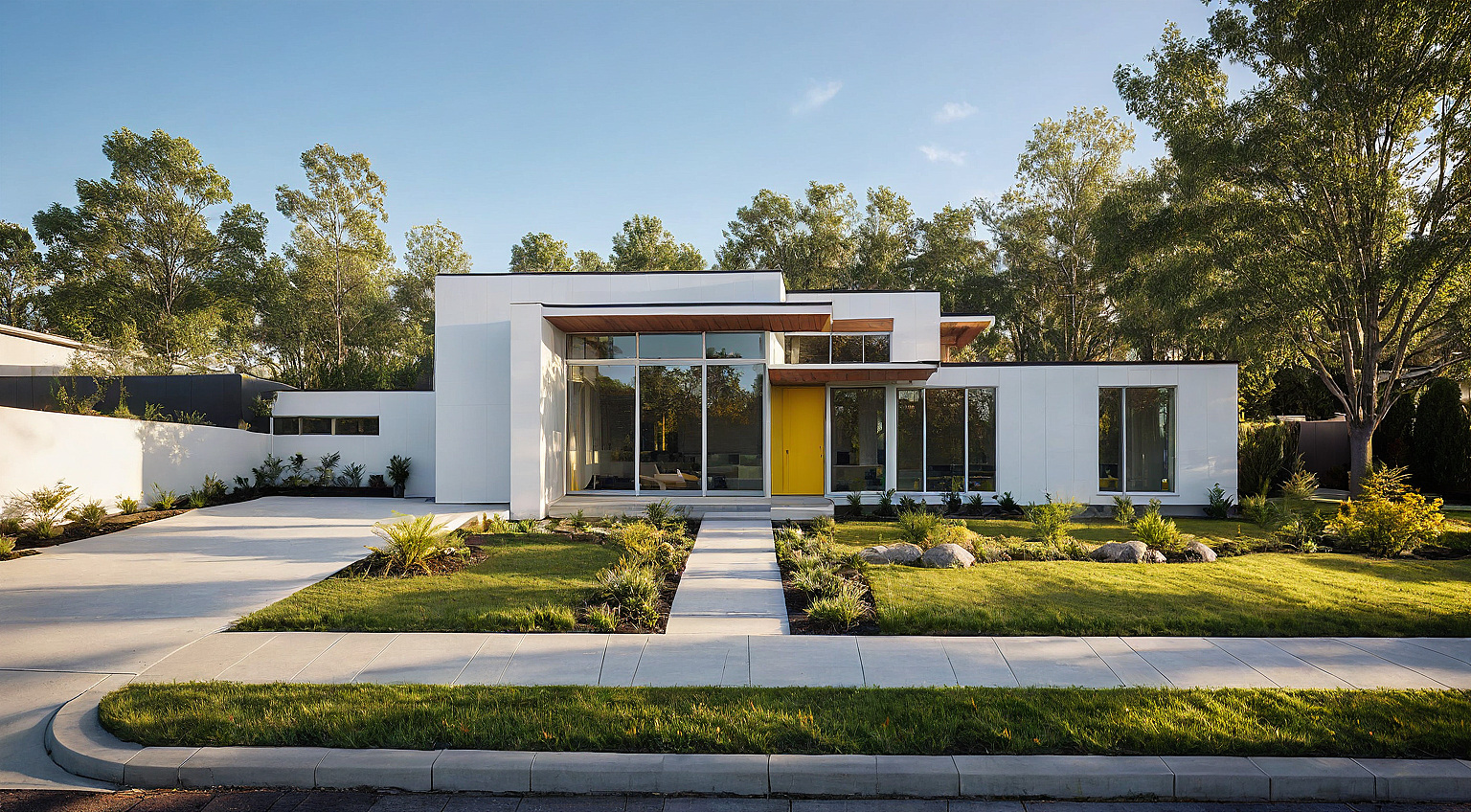 PromptA modern, minimalist single-family home with a flat roof, clean geometric lines, and a warm, inviting color palette. The façade features large glass windows framed by sleek white walls, accented with vibrant yellow elements and a decorative breeze block privacy screen. A well-manicured lawn with lush greenery enhances the contemporary design. Soft golden sunlight casts long shadows, creating a serene and harmonious suburban setting in the late afternoon